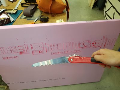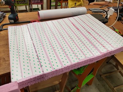 I decided to overlap four pink foam. I used double-sided tape because the pink form-only glue would take 24 hours.