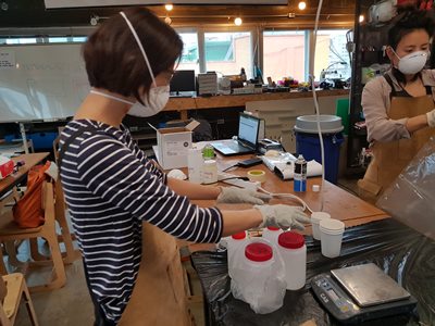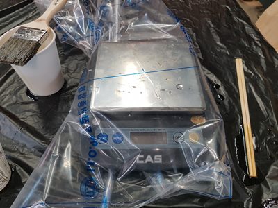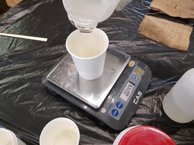 Resin to make burlap composites. Mask, gloves and scales. Chopsticks, disposable water cups, burlap, and vacuum pouches.