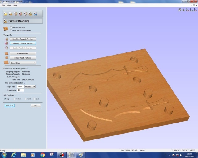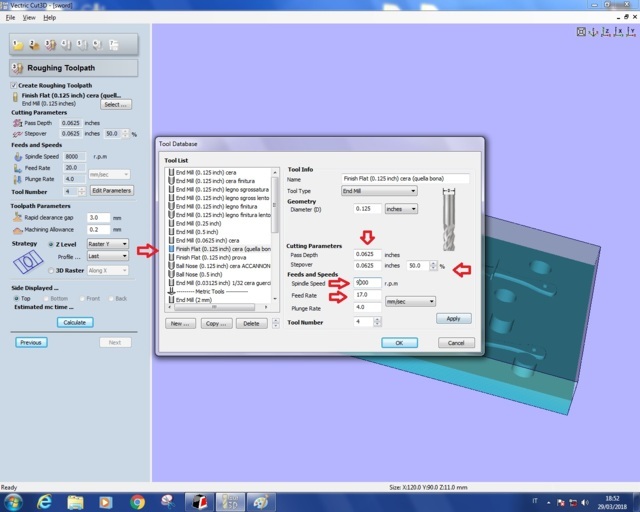 Some info on Vectric Cut 3D: there are several parameters to insert and two different files to save. In fact the first part of the work will be roughing (and in our case the 1/8 tip will be used) while the second part is finishing (smaller tip, 1/16).