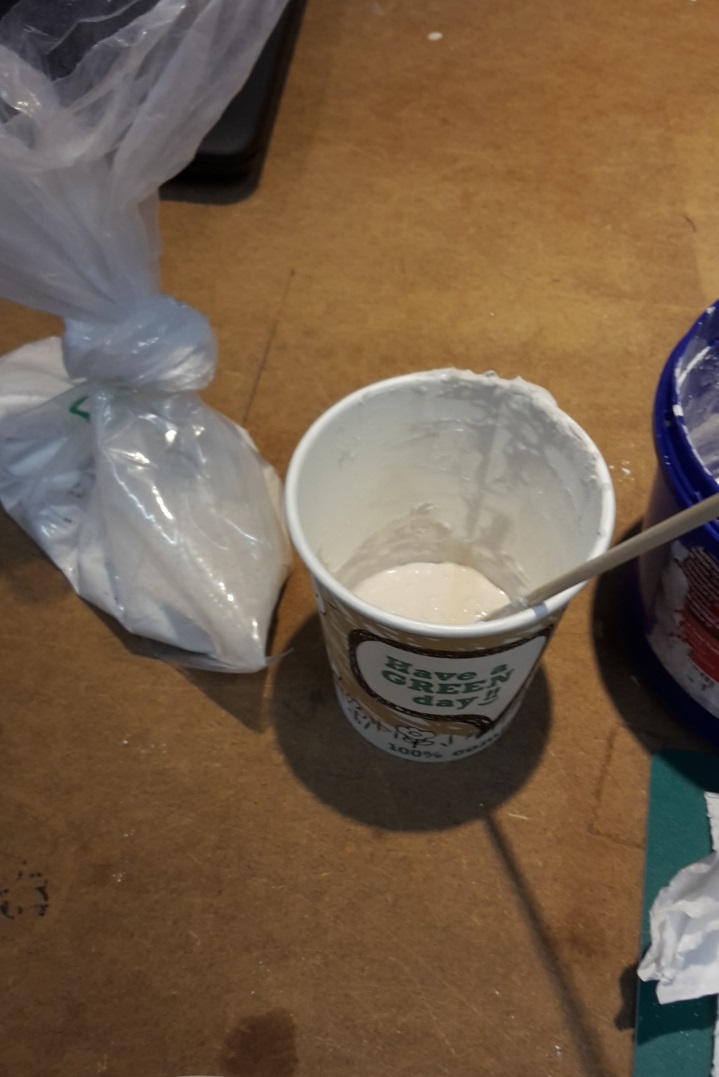 I then tried with mixing some plaster. I had a cup of water and then mixed in the plaster until I had a sticky but not liquid texture.