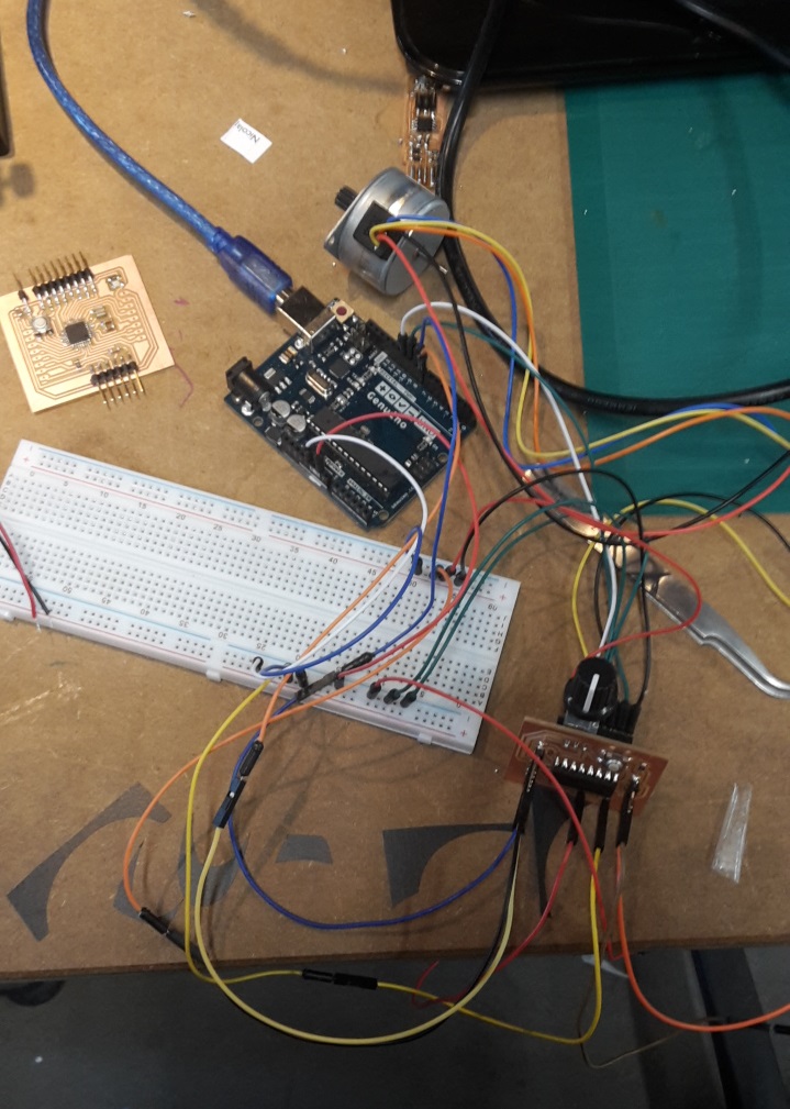 I've been having some problems with my arduino board. Even though it worked with burning the bootloader. I now doedn't work when I have connected it to my motor controller board, the motor, bread board and the fabISP. It can't upload the code on the arduino.