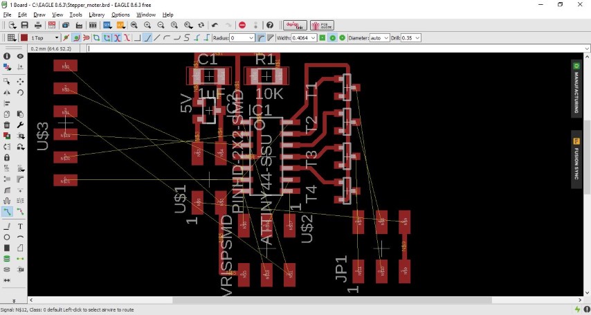 I followed the hello.stepper board to make this board that can control stepper motors. I made one change, I added four pins to the not used pins on the ATtiny44.