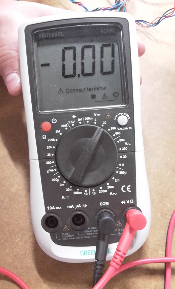 The multimeter should be set on 20V. GND should be connected directly to the board. But the VCC should be attatched to a screwdriver (check if curent is going through the screwdriver before you use it), then when you are turning the screw it is showing a number on the multimeter.