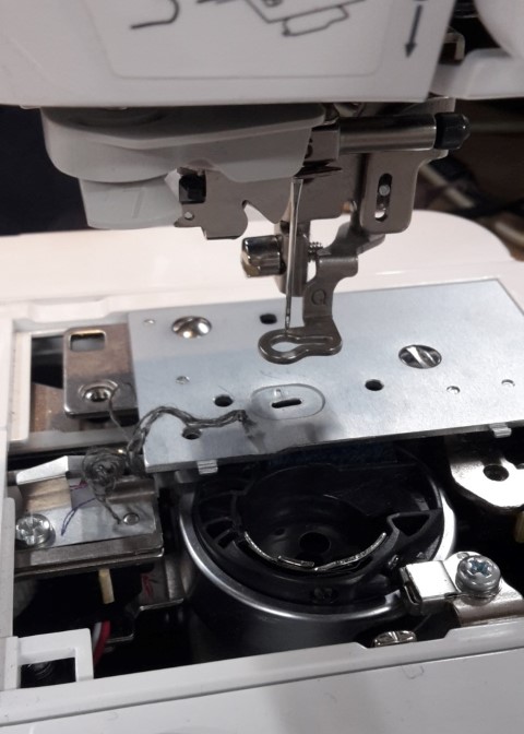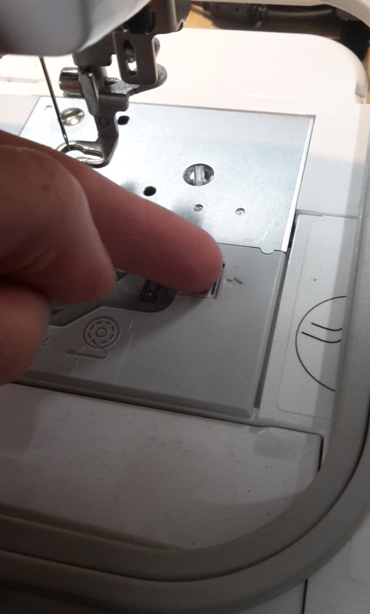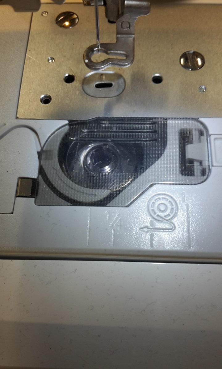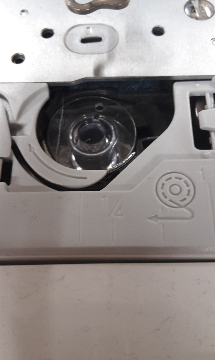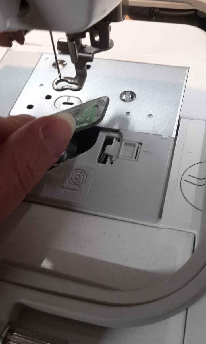 You change the bobbin by pushing a little button to the side, this will pop the lit open and you are now able to remove the thread and insert your desired colour. There is a little drawing showing you which way the thread should run.