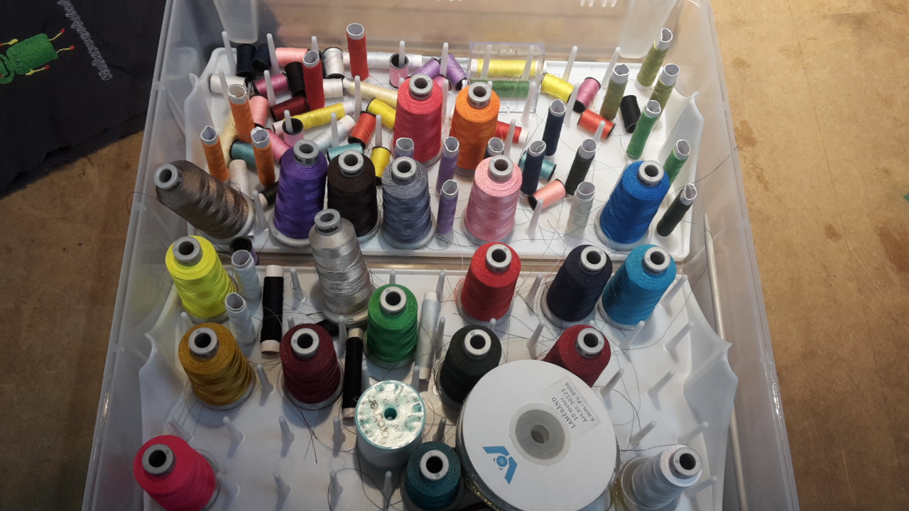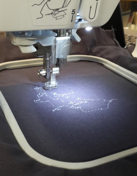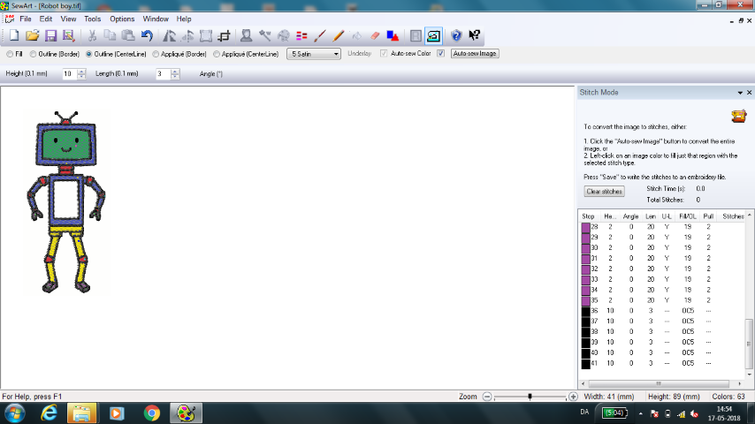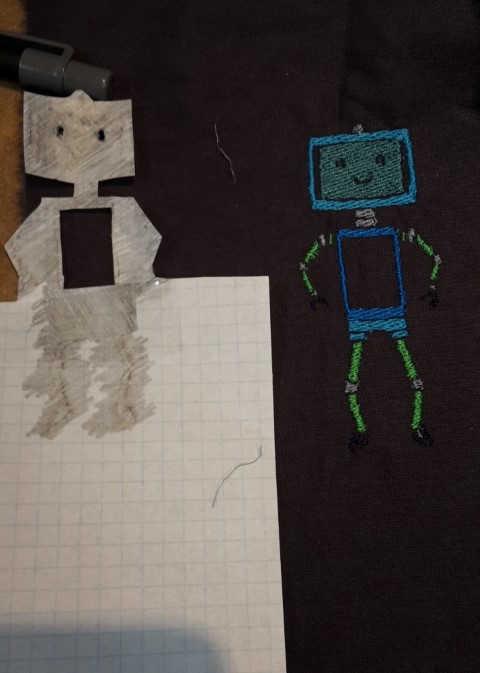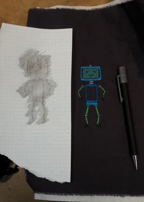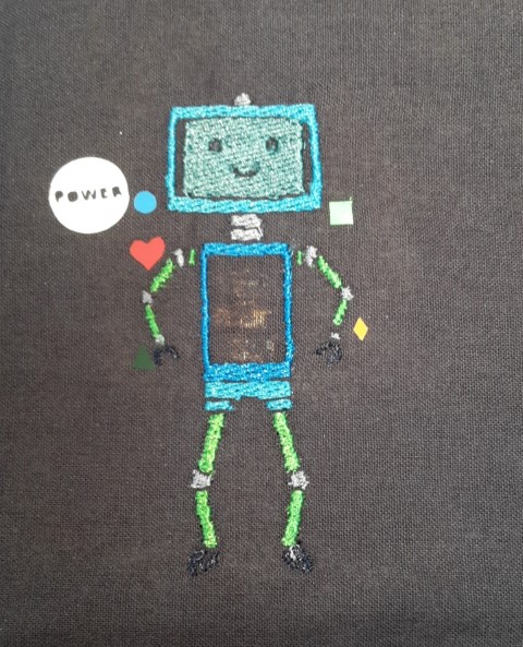 In the sewing program there is a function called auto sew. This will choose all the colours of the same nuance. I used this for the inner fill. When I wanted to make the outline of the robot I accidentally chose the function that will make a line on both sides.