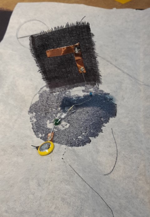 I then tried another version where I used a big LED and a resistor and then soldered onto copper with tape on the back side. The copper I used here is something we have in a thin line. I then added the copper to another piece of fabric. In this way I had made a button.