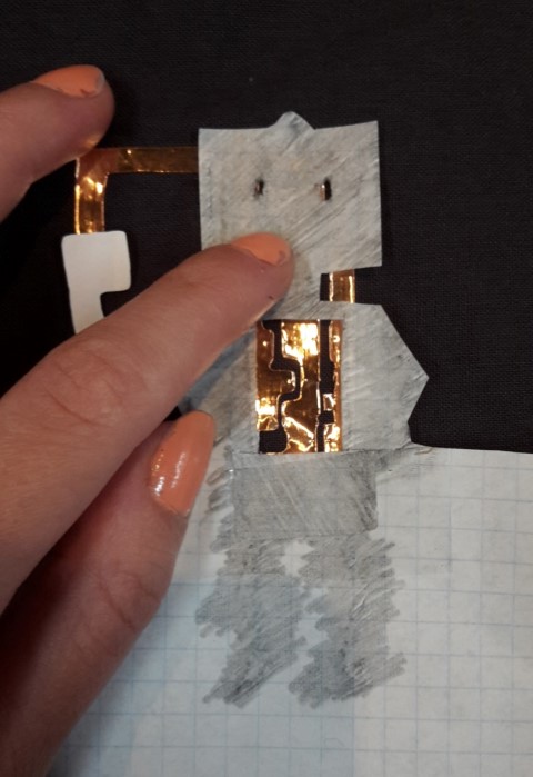 I still wanted to use the small LED’s because this could be fun for the robot. I wanted him to have light in the eyes and in the stomach, so i needed to place it pretty precise. I then thought that I could just sketch it out and try using the vinyl cutter and the sheet of copper that we have.