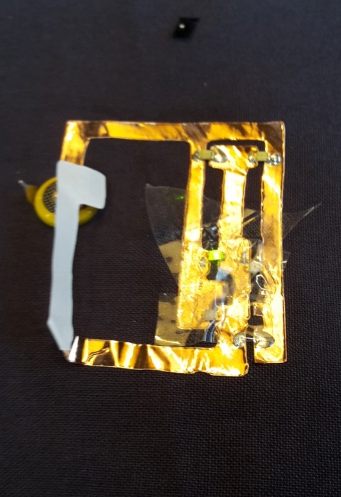 After I fixed this I could attach it to the fabric. I kept the paper on the arm i bended so I can use it as a button without it sticking to everything.