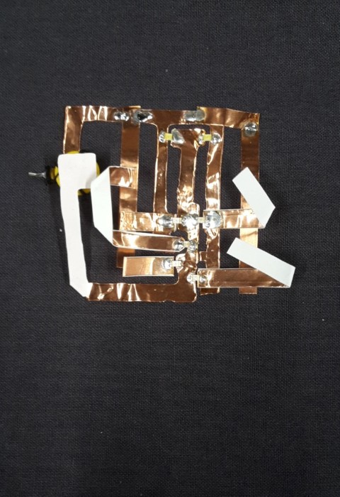 I made a test with the LED’s and found out that I couldn’t have all the different colours on the same time because the red is taking most of the power. So I either had to have the same colour or do something so the LED’s wouldn’t get power from the battery at the same time. I then used the copper tape to make extra paths and made buttons to each of the LED colours. In this way I could switch between the colours.