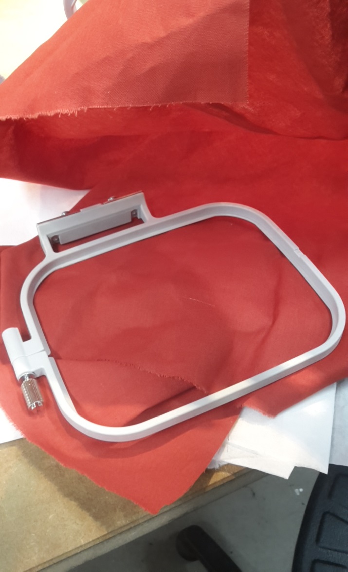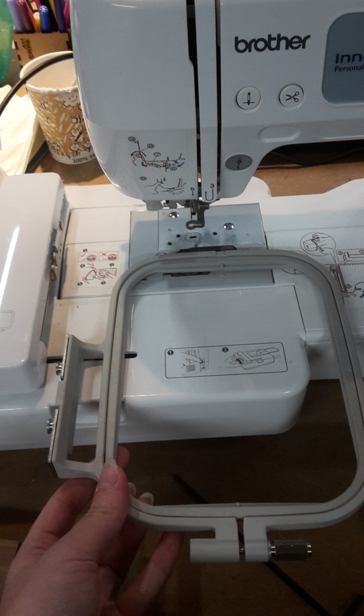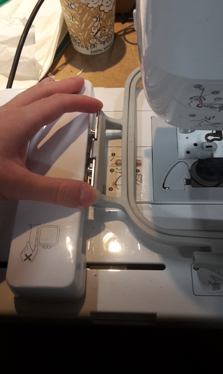 Insert the frame to the machine. Be careful here, because the frame needs to go underneath the needle and then it should be pushed on place in the side.