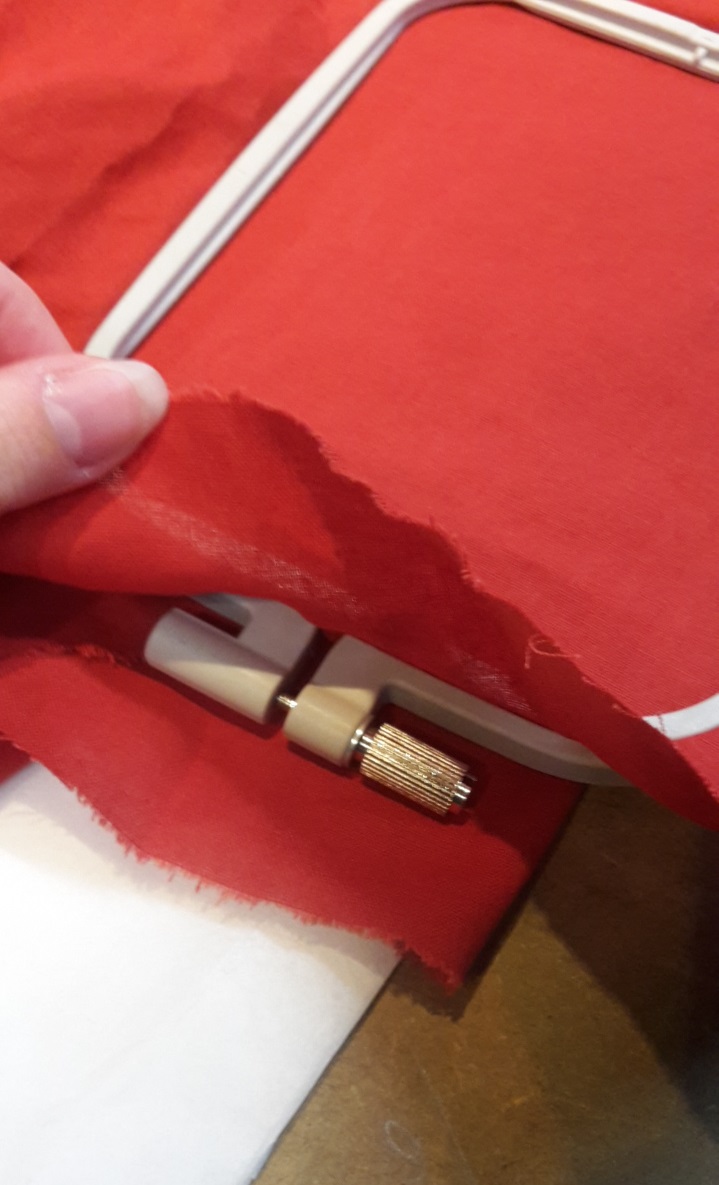 When you insert the fabric, put the bottom of the frame on the table. Unscrew it a bit so it is loose.