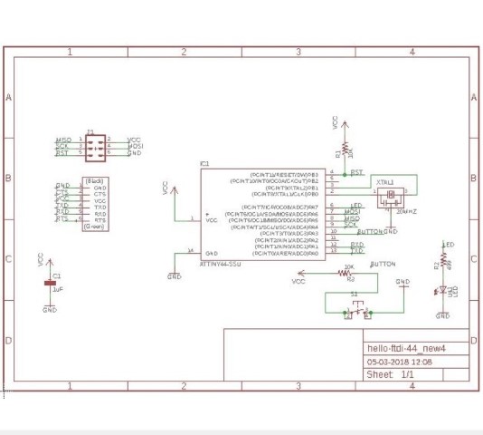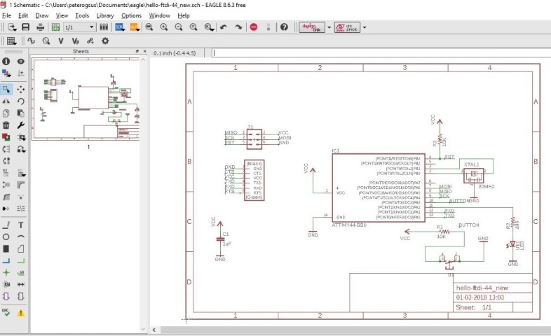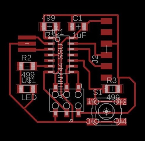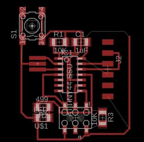 Now I had added all the components (LED, button, resistors, GND, VCC) in Eagle and combined them to the ATTINY4. Then I needed to design the whole thing, with all the paths.