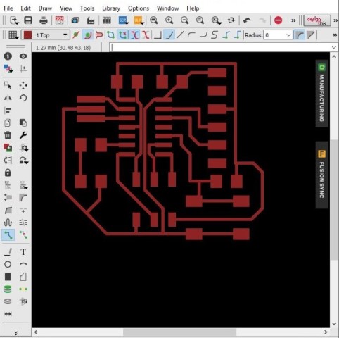 It is very smart because Eagle gives you some yellow lines which is saying “these two or tree should be combined with a line”. So you “just” have to follow the line. The hard part here is that if the lines shouldn’t be connected, they can’t cross over each other. But the program won't allow you to do this, so you can’t do this by accident. It is kind of like sitting with a puzzle. And because the assignment said that we should design our own I sat with this puzzle for many hours. After a while I was looking at the tutorials design, but still wanted to make my own, but I couldn’t get it to work. In the end I just followed how the components were placed. This didn’t work either, so something was wrong… In my drawing where I say where all the parts should be placed, and where I add components, I had switched around on R1 and R3. After I figured out this problem, it was slightly easier.