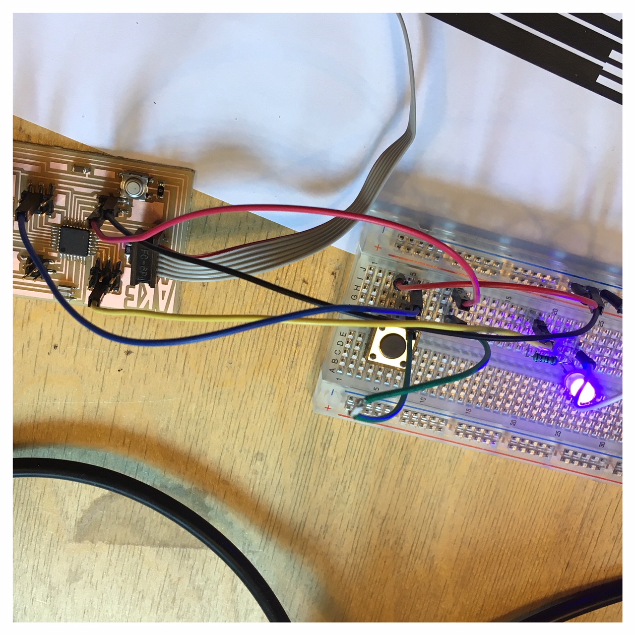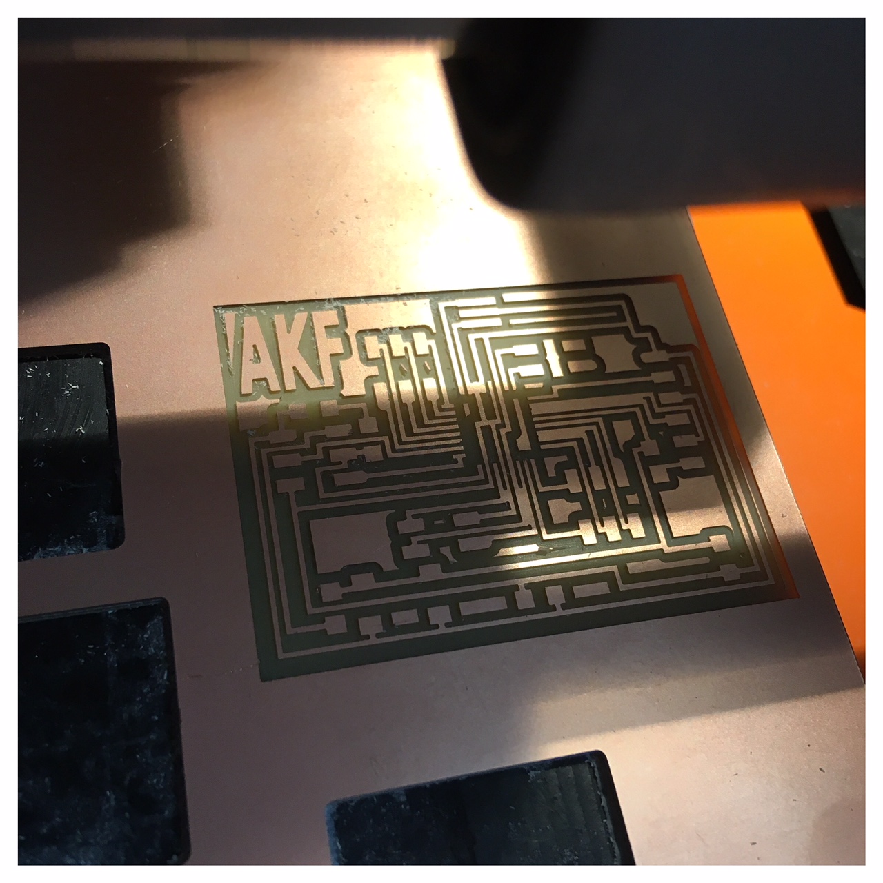 This went a lot better. I milled, soldered, burned bootloader and programmed the Fabduino with some basic code examples form Arduino IDE in one day. I will use this AKF Fabduino to become wiser on the code sections related to my lamp projct and to find out what I need (or may be without) in relation to my Final Project.