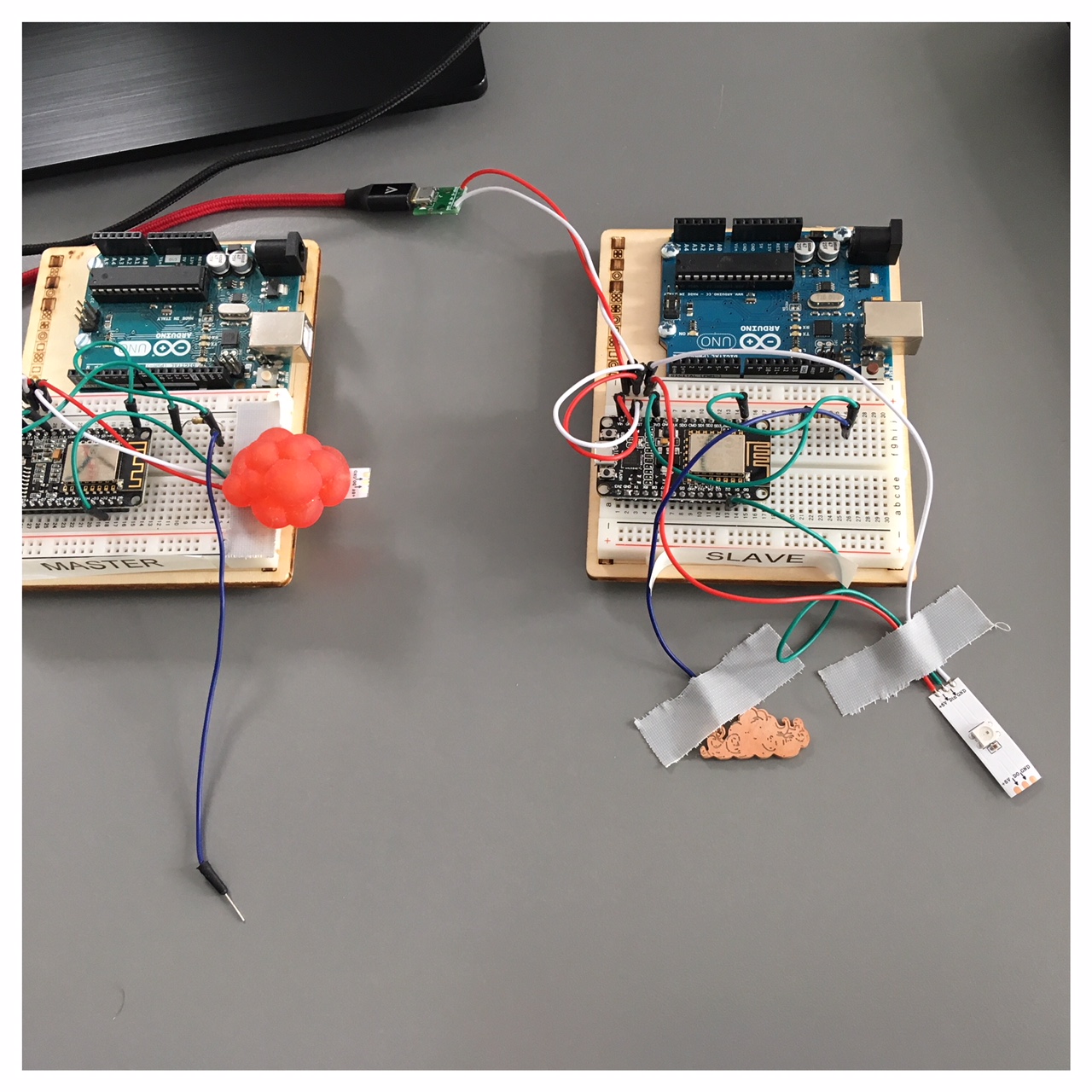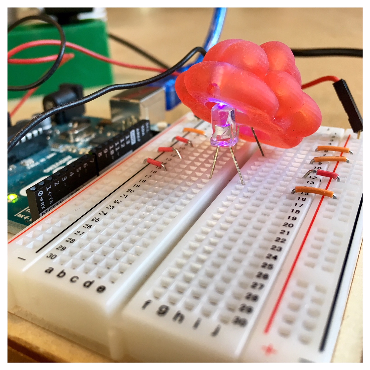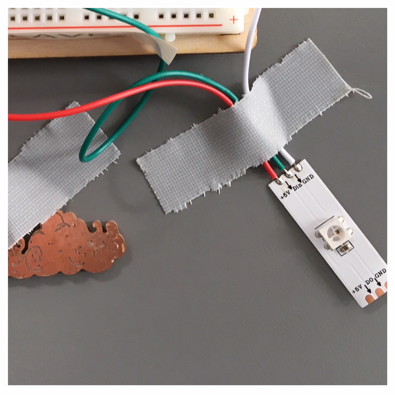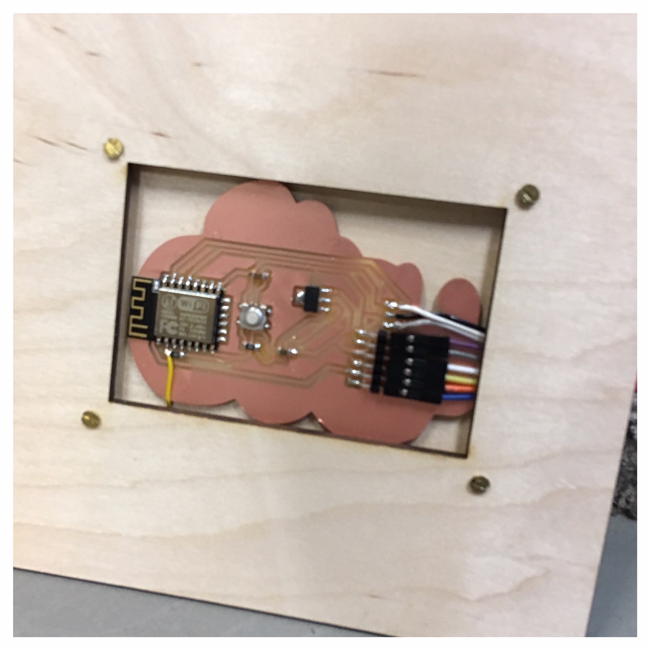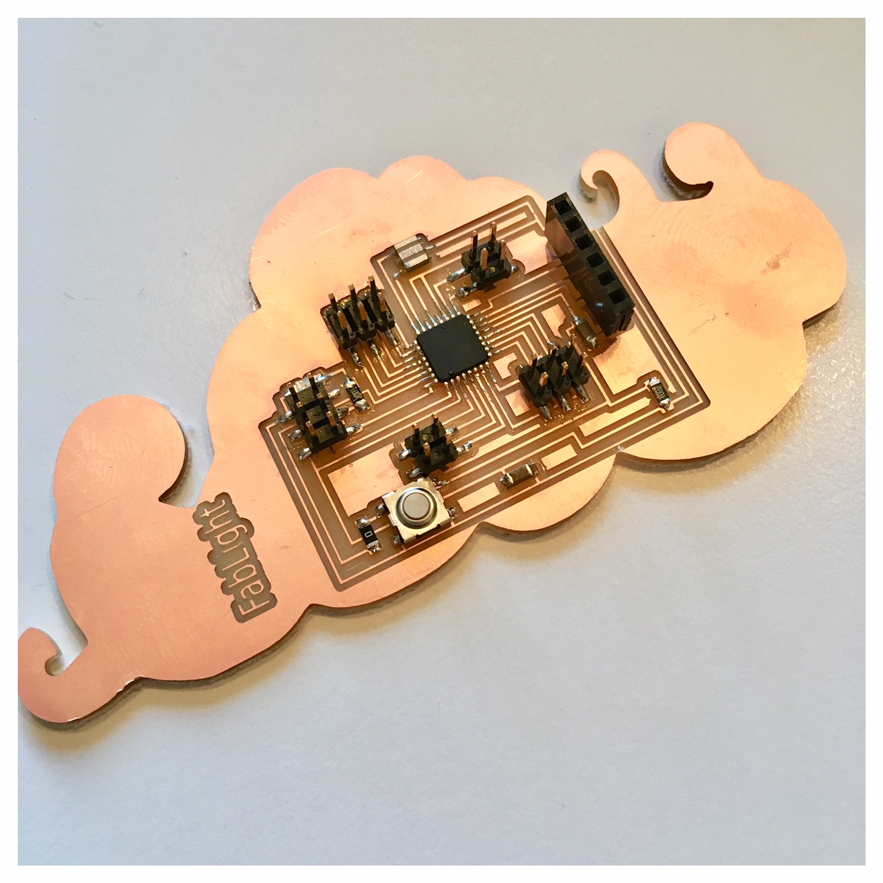 After working with the AKF Fabduino and the FabKit that I made I wanted to try putting my own little touch on a Fabduino-version. So for the hart and brain in my lamp I created this little Fabduino with my handdrawn cloud as the frame. I also attached a female socket for the FTDI so I later kan plug in my ESP-module. I made sure that every pin was available so I - and others - have the opportunity to continue experimenting with the lamp. I think in time the students should be encouraged to hack the lamp, giving it some of their own soul.
