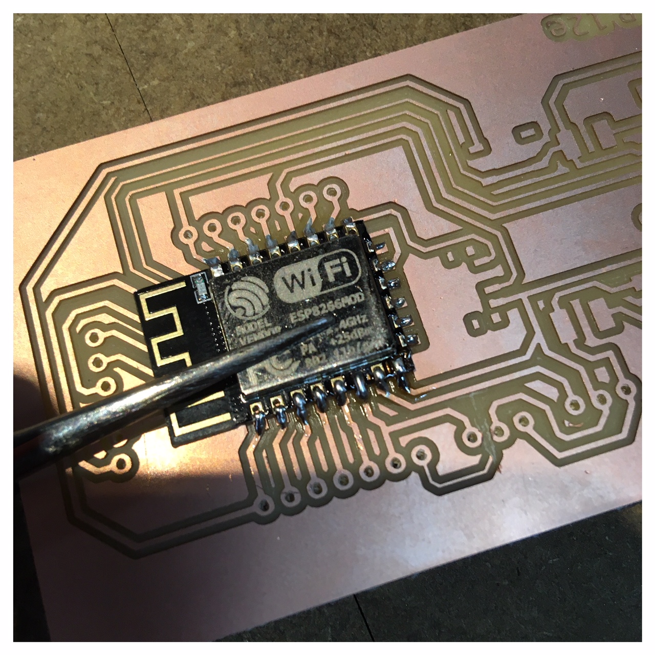 My next step was to draw a new schematic and figuring out the puzzle of the board in Eagle including the modifications and the extra components I soldered to the other ESP board. I made the schematic and added one 100 K resistor and three addistional traces.