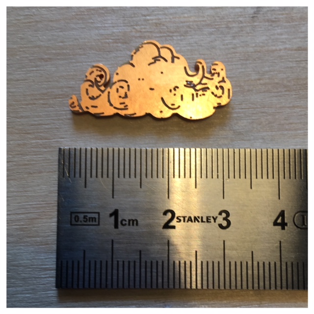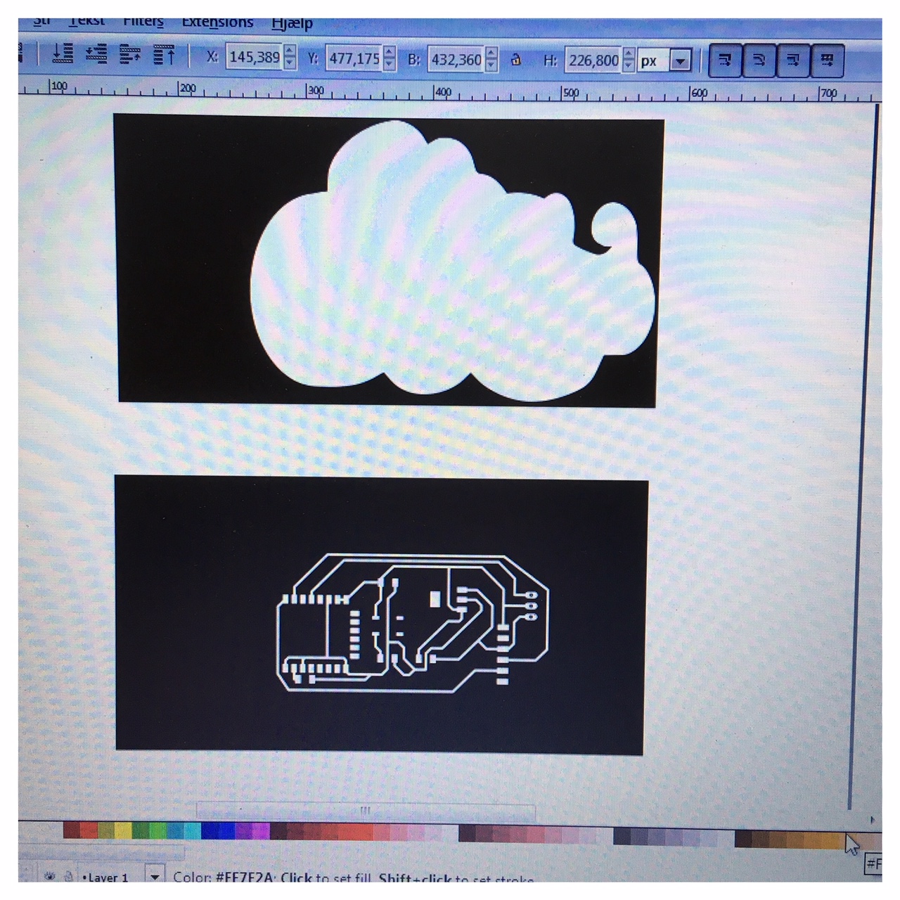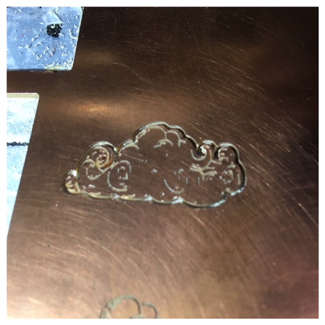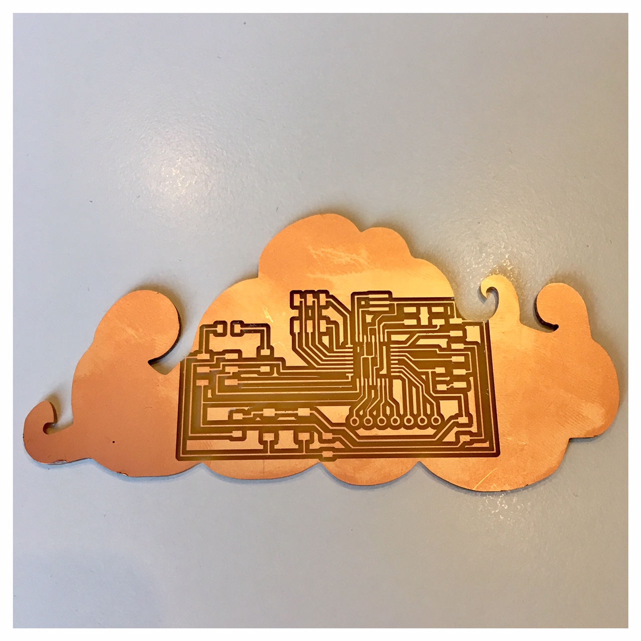 At the moment I like some kind of touch button on my lamp and I'm also working with a code part and microcontroller set up where there's just such a touch button. I have therefore made a small copper cloud with the same file I used to laser cut and engrave the acrylic cloud for one of the lamps. For the cobber cloud I used Fabmodules and the Roland mill. I engraved the curves of the sky just as we make traces on the PCB and the sky's perimeter like when we make an outline or cut out. I think it came out butiful and when it's glued to the concrete base I think it's gonna be great.