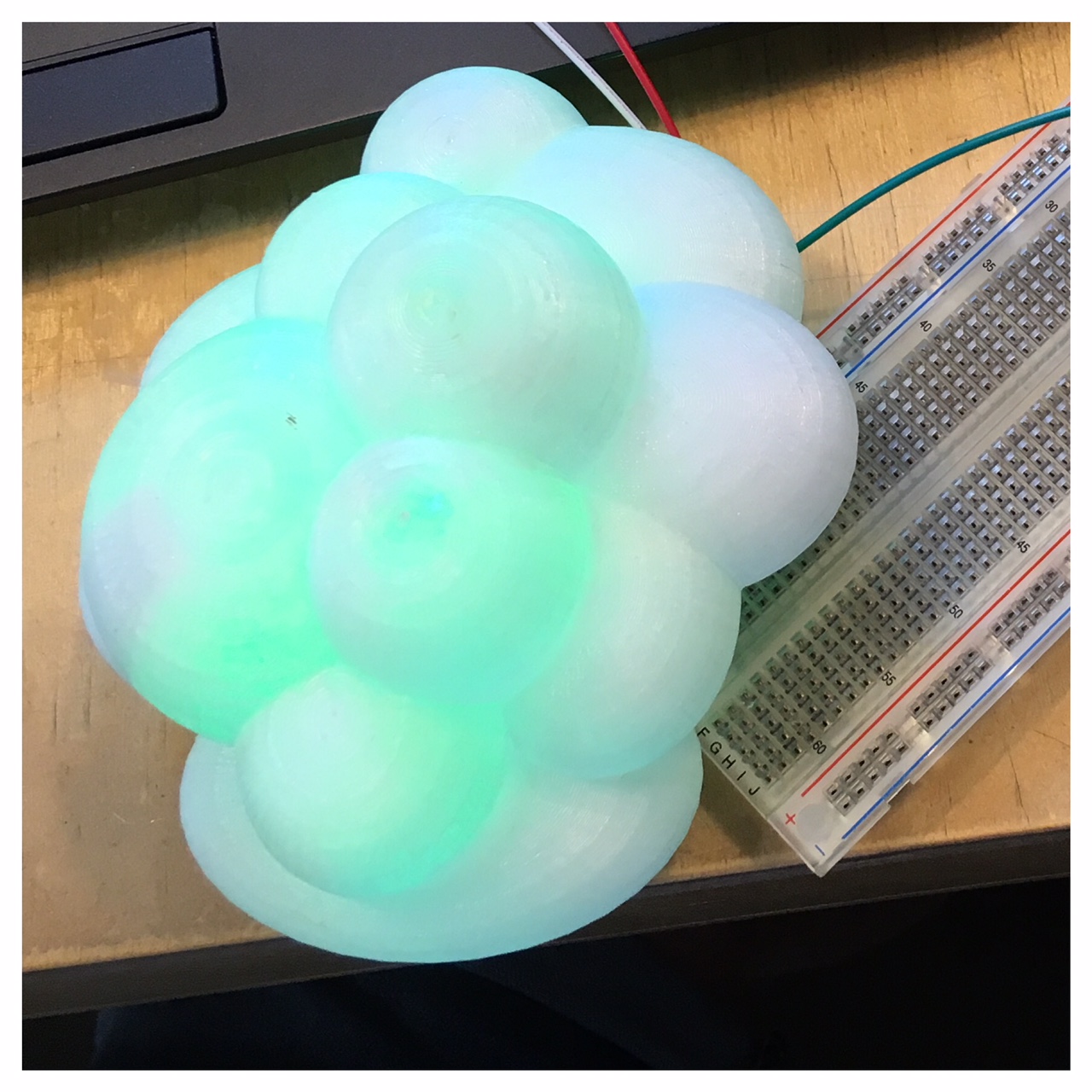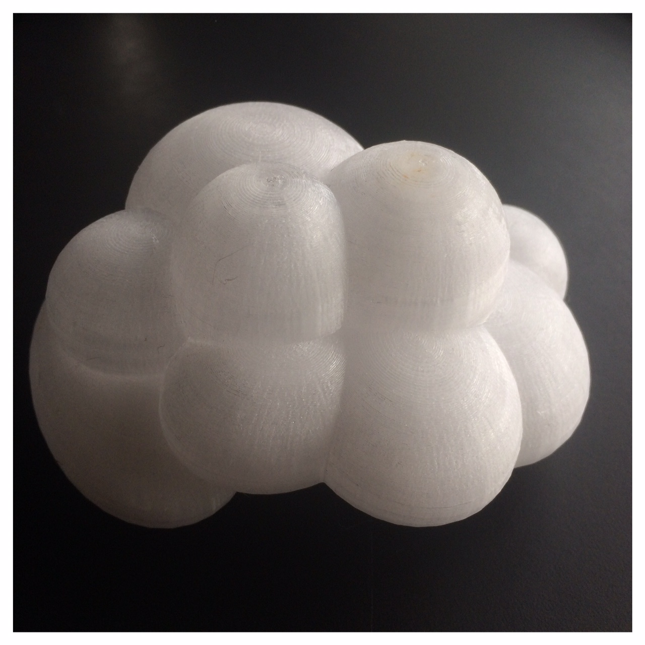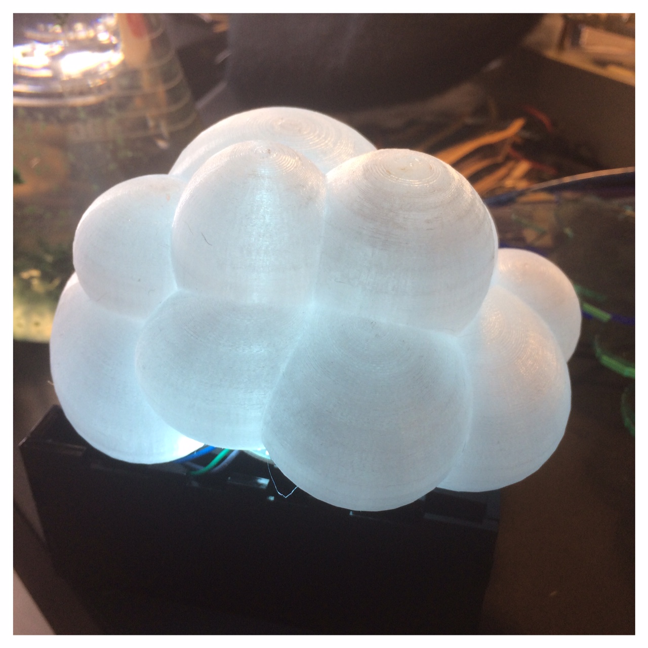 Today -in week 7- I just finished a 3D-print of my cloud printed in PETG on a Prusa i3. It was a 19 hour print with some different kinds of support. I printed it in transparent PETG so I can sample different kind of LED-ligt sources. On picture number 2 I just put in a simple LED ring in to get a idea of how tranperent it is.