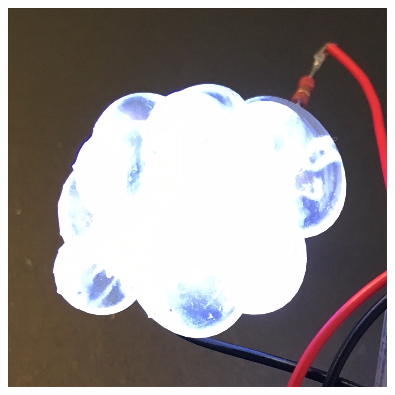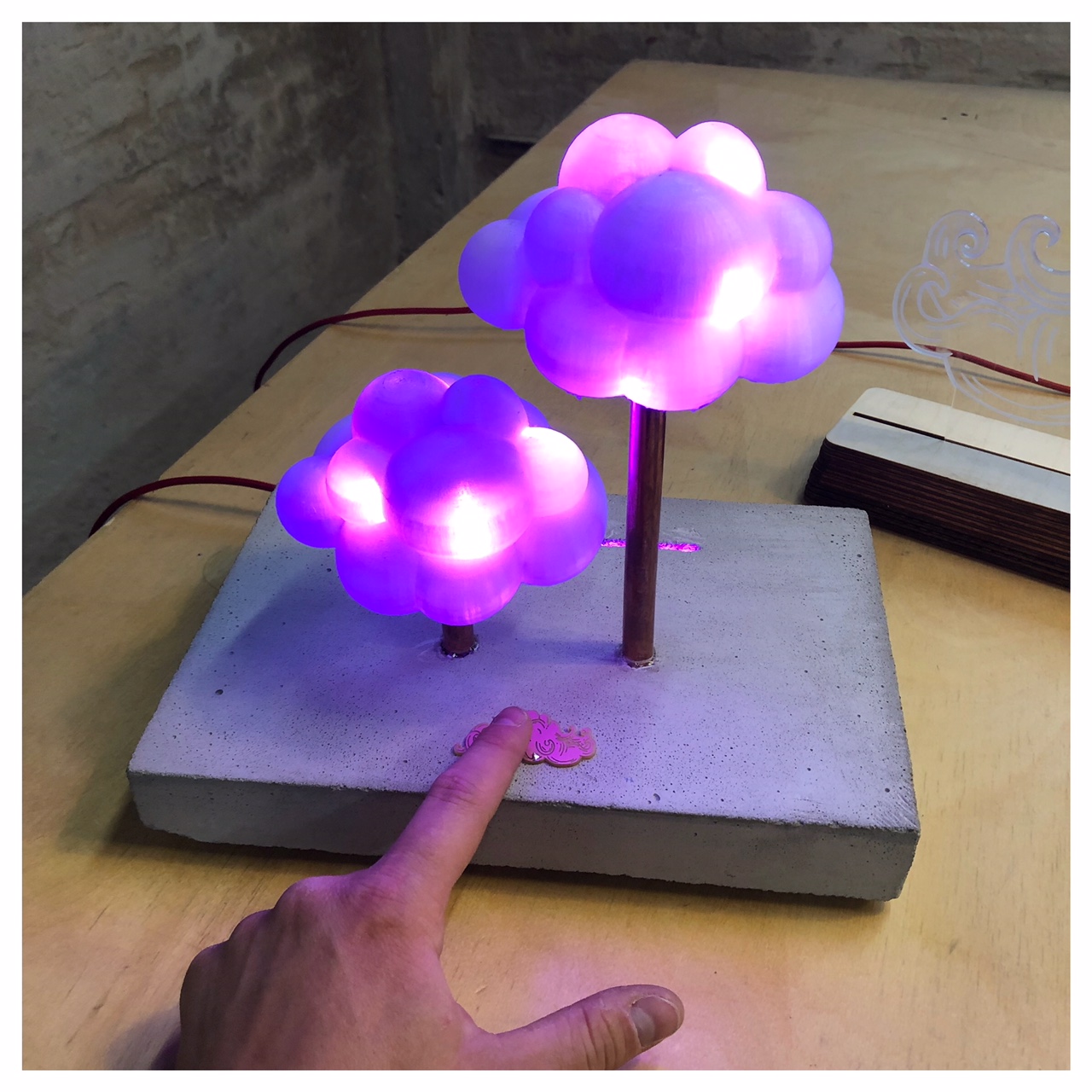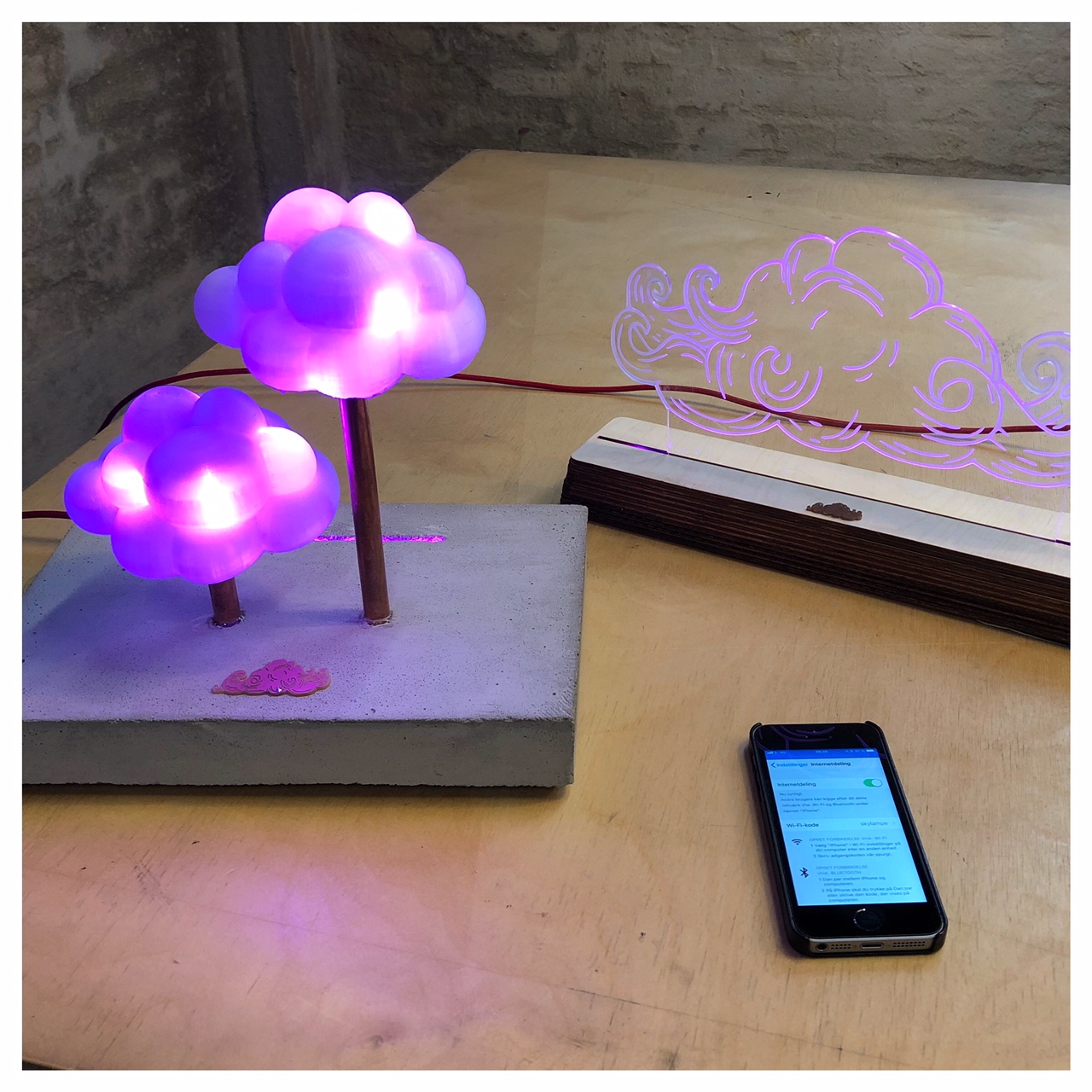I intend the lamp to be cut like a cloud in light blue flourorised plexi glass, three clouds side by side, with LED-diodes and a bottom of wood (See the sketch below)