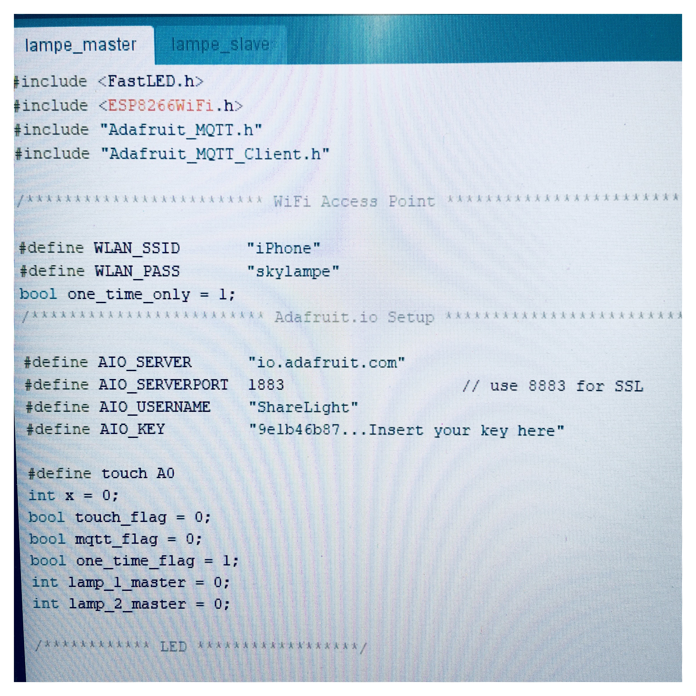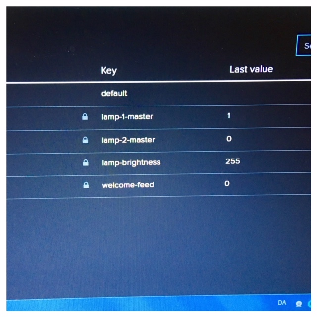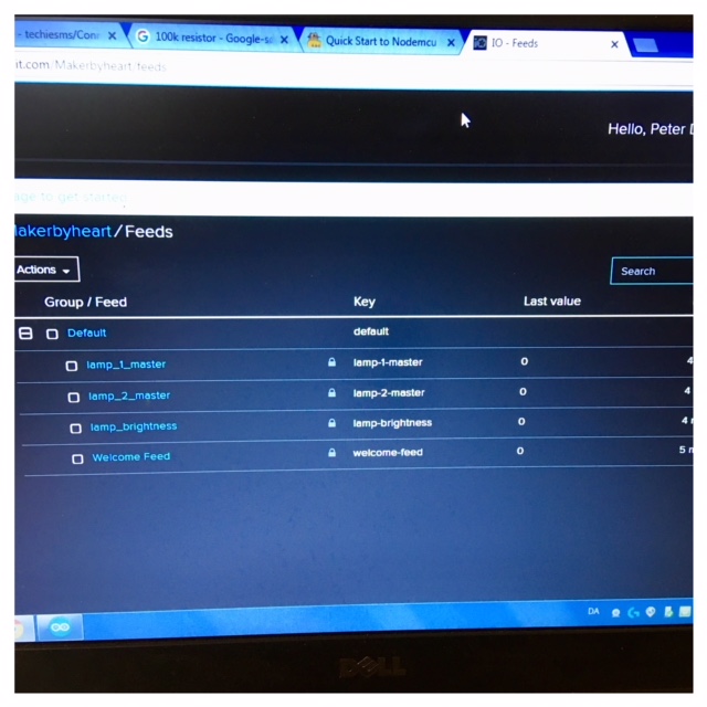 I added the board node MCU 1,0 (ESP-12e module) to my ArduinoIDE together with the Adafruit Libery (lib) and ran a code sample for Arduiono. I changed the server info and added the AIO key a got from Adafruit in the script and it worked. As you can see on the pictures below I am now sampeling the lamp-1-master. There is one more lamp added the server lamp-2-master (that is going to be build by the kids in Mutku Maker Space in Finland). As for now the lamp is responding to the server as you can see by the number 1 and as you connect with the lamp the brightness will turn up and hopefully with time connect to the other lamp.