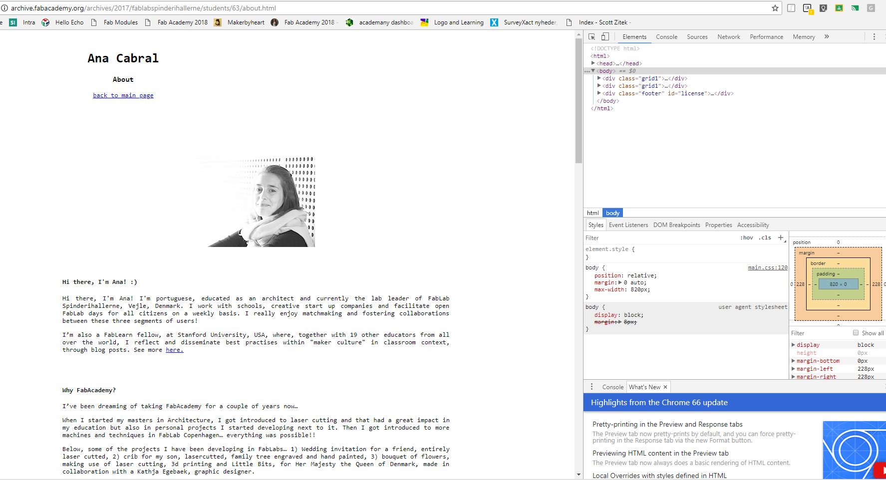 For this assignment I got very inspired by our local fablab manager Ana Cabral and a former student called Nicolas Kisic Aguirre's student web pages. I love the simple struture and the easy overview that their sites create. Here below you can two pictures of the mentioned students and use these following liks to visit their websites.
