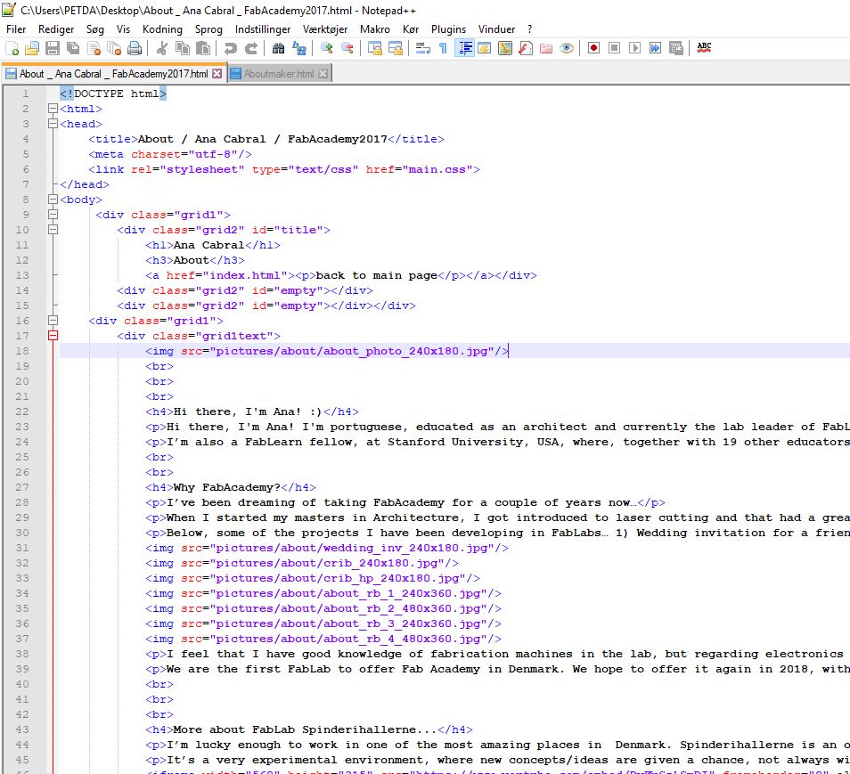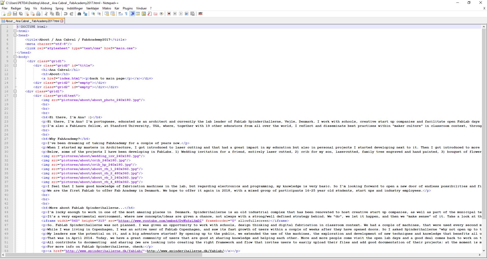 To build up my student webpage, I used Notepad ++. I started copying Ana Cabral's website structure. I went to her website and right clicked on the different parts and saved them on my computer. Once saved, I could open them in Notepad ++, as you see in the image underneath. In the first picture you can see Ana's About page copied into Notepad ++.