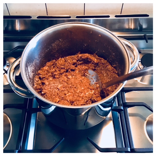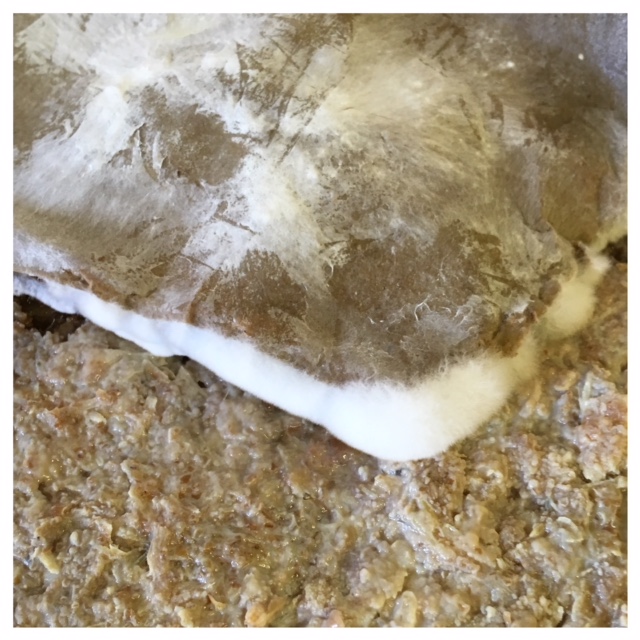 After 8 days, I had enough growth in my mycelium to dare going on to growing the mycelium further on in a homemade substrate of finely chopped dried straw, wheat bran and sawdust. All cooked for 30 minutes.