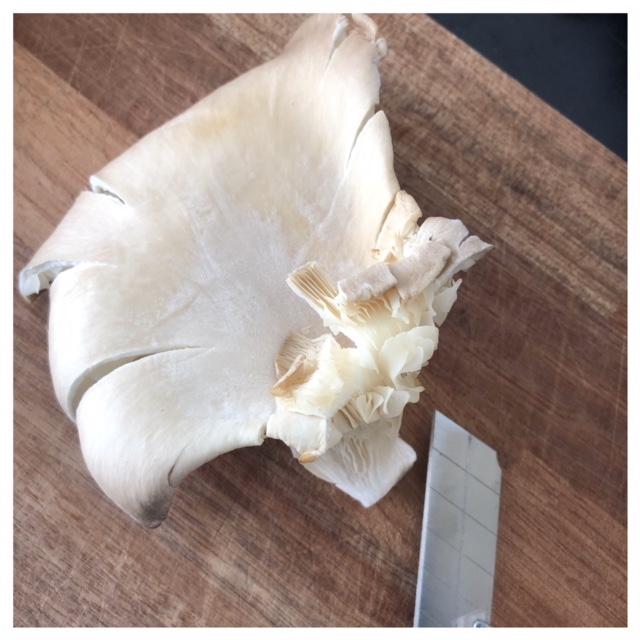 After a thorough search on the web on everything from "How to grow mycelium" to "Biodegradable plastics", I found out that the mushroom that is "easiest" to grow is the oyster mushroom. I bought a package at the market and chose a package where the bases of the mushroom was fairly long on each of the them because you only use the base as this is the reproduction part which will grow within the cooked cardboard. I used a really sharp knife to cut tiny slices of the base and inserting them in the carboard layers.
