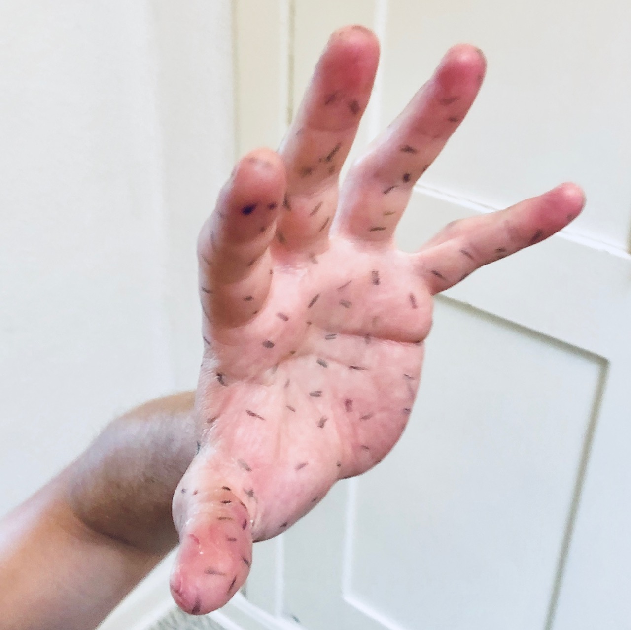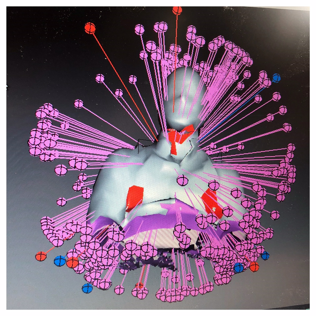 After trying the 3D scanner for the iPad I tried Photogrammetry (a science of making measurements from photographs, especially for recovering the exact positions of surface points). I had read that it was a good idea to draw black dots on the object you needed to scan, so I drawed black dots all over my hand. I took 200 pictures of my hand to get a more detailed result.