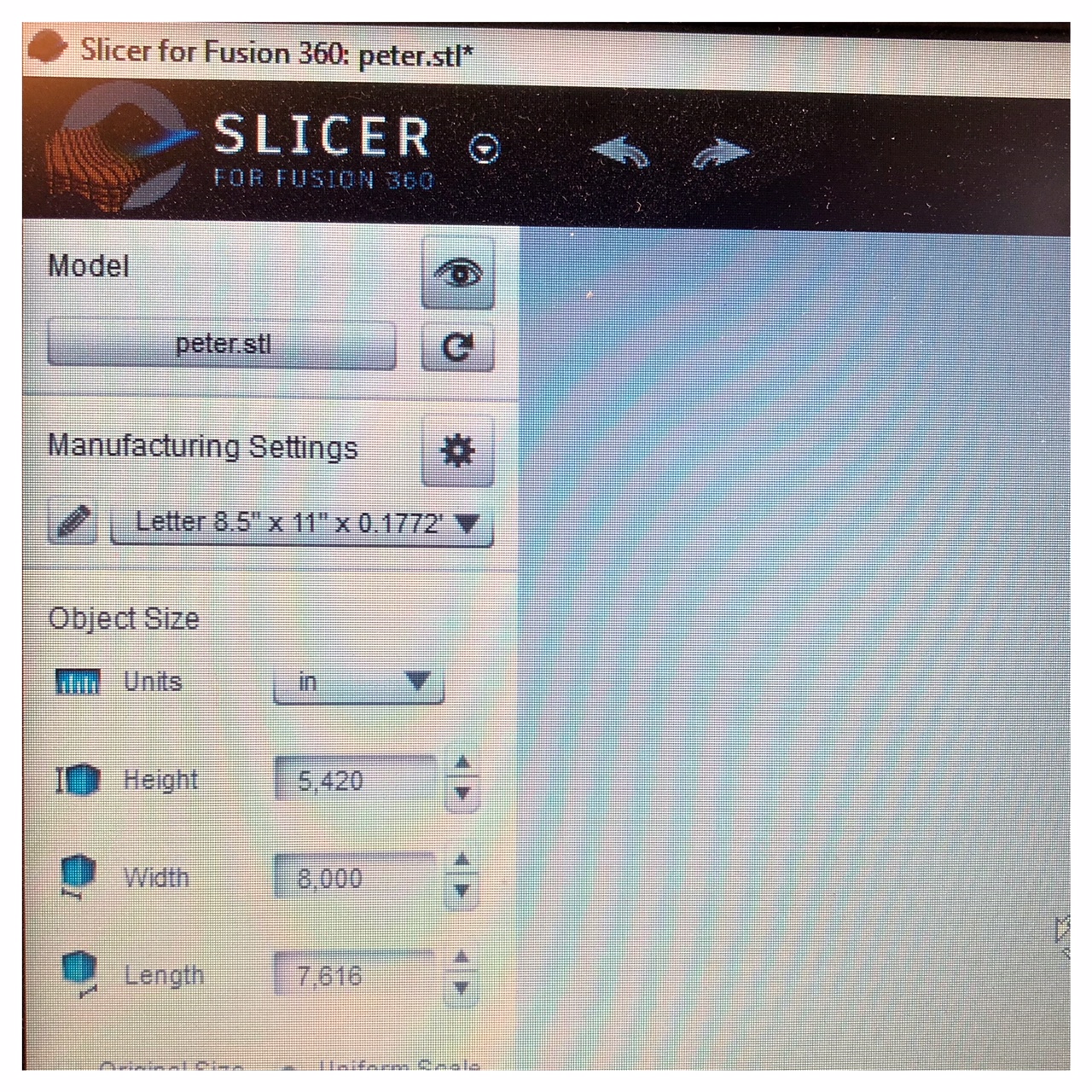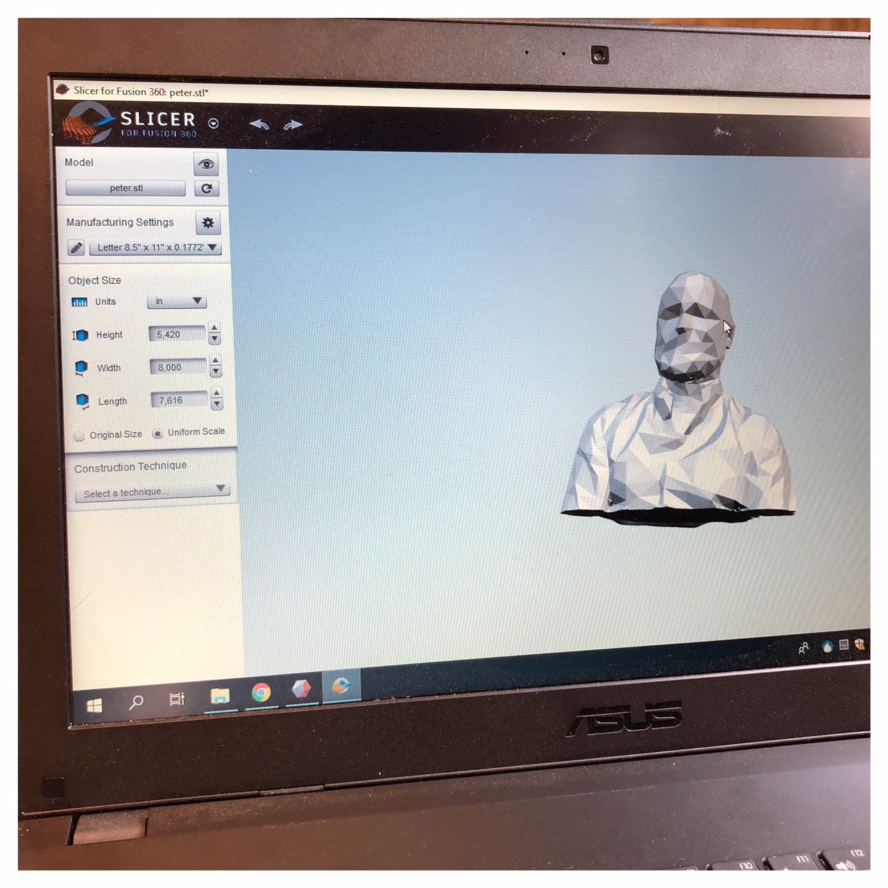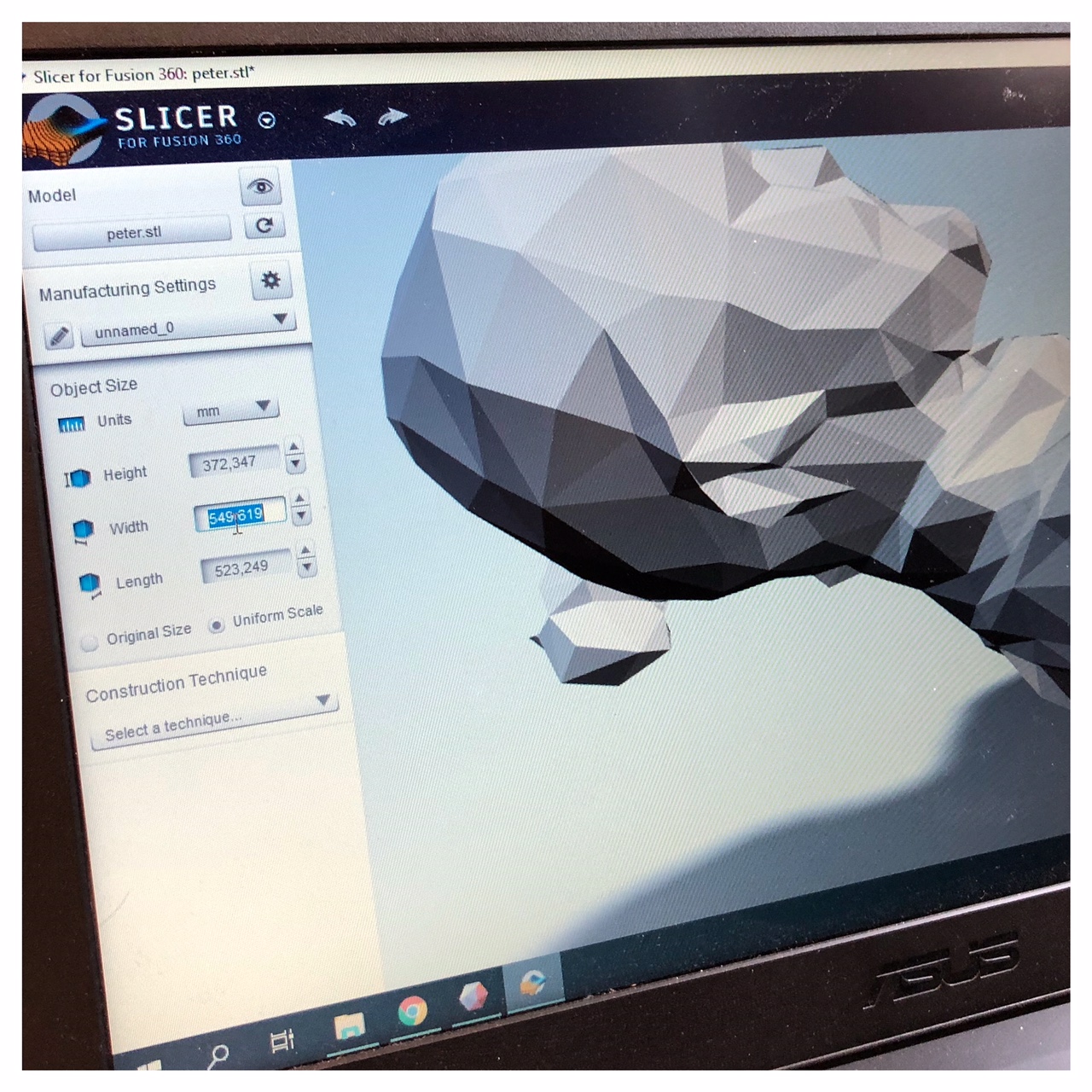 Using Slicer for Fusion 360 I get the opportunity to slice my mesh (.stl-file) into a specific dimension. Here I sliced it into pieces of 4,8 mm which fit the thickness of our cardboard in the lab. My intention is to make a bust of myself in slices of cardboard.