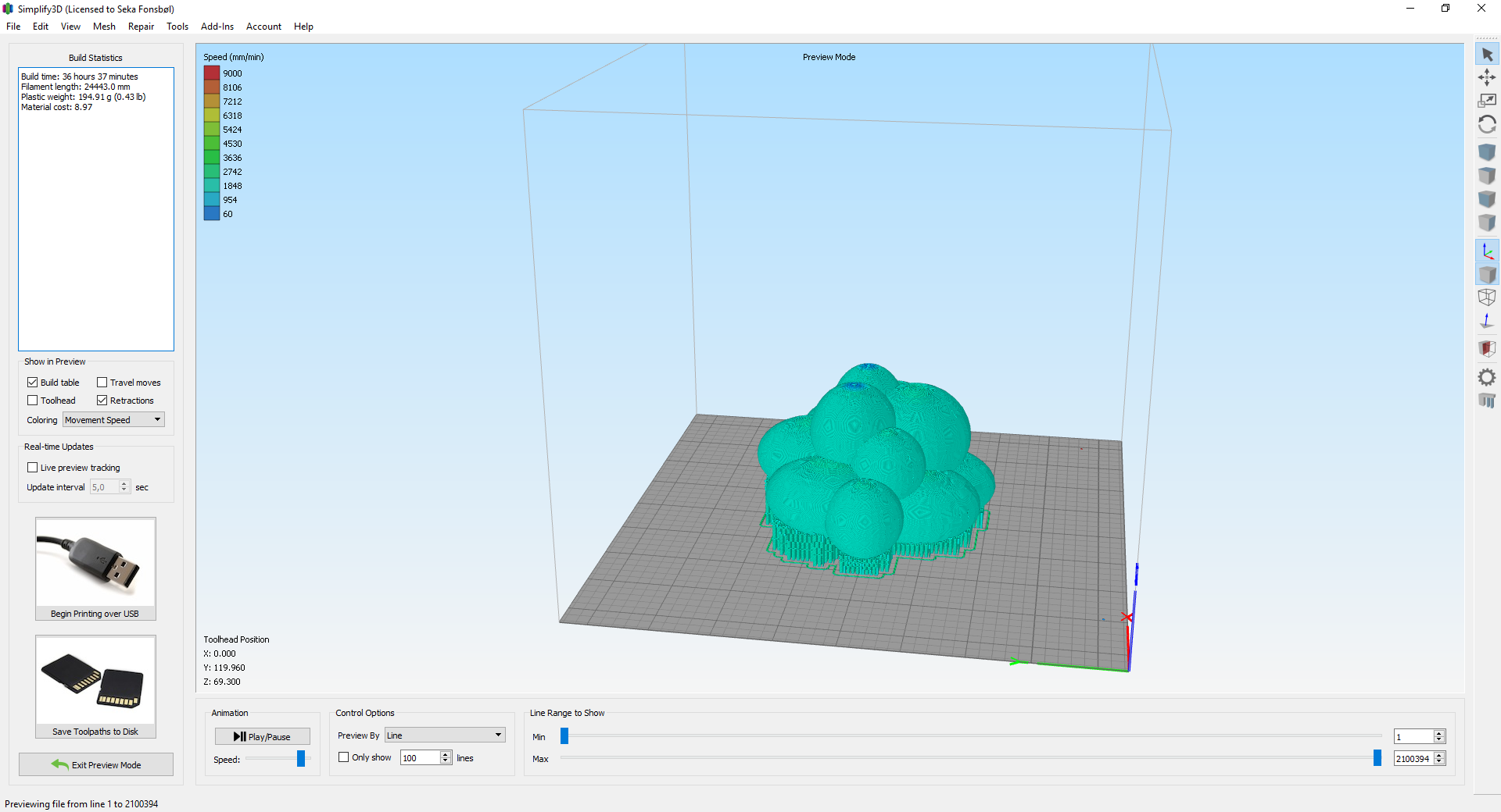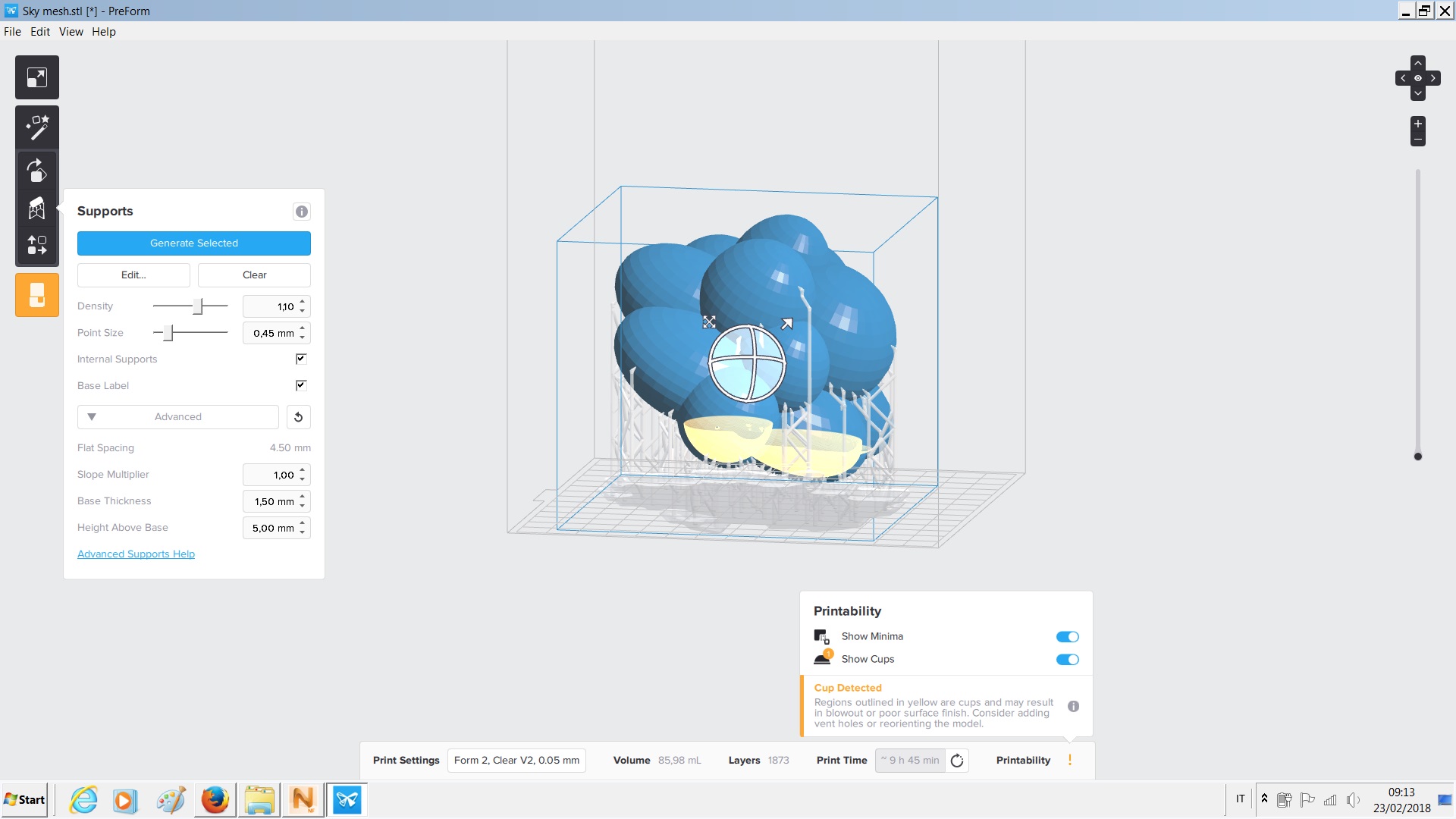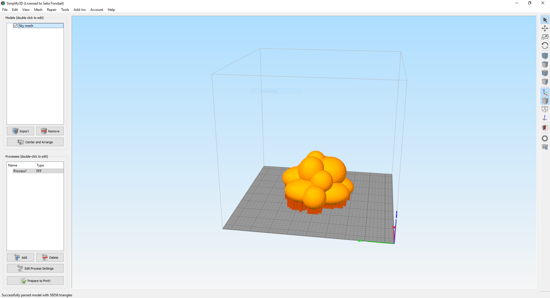 For slicing my cloud and preparring my file for the 3D-printer I used a software called Simplify3D simplify3d I worked with a layer hight on 0.2 and a 0.4 nozzle, the infill was 100 % (and quite hard getting out of the cloud, because of the small hole and all the curves). I set the support structures to support everything that slopes under 45 degrees, and it was only under the buttom of the cloud. It still needed support under the cloud because I made the button uneven, to make it look more realistic and create some nice light shapes underneath.