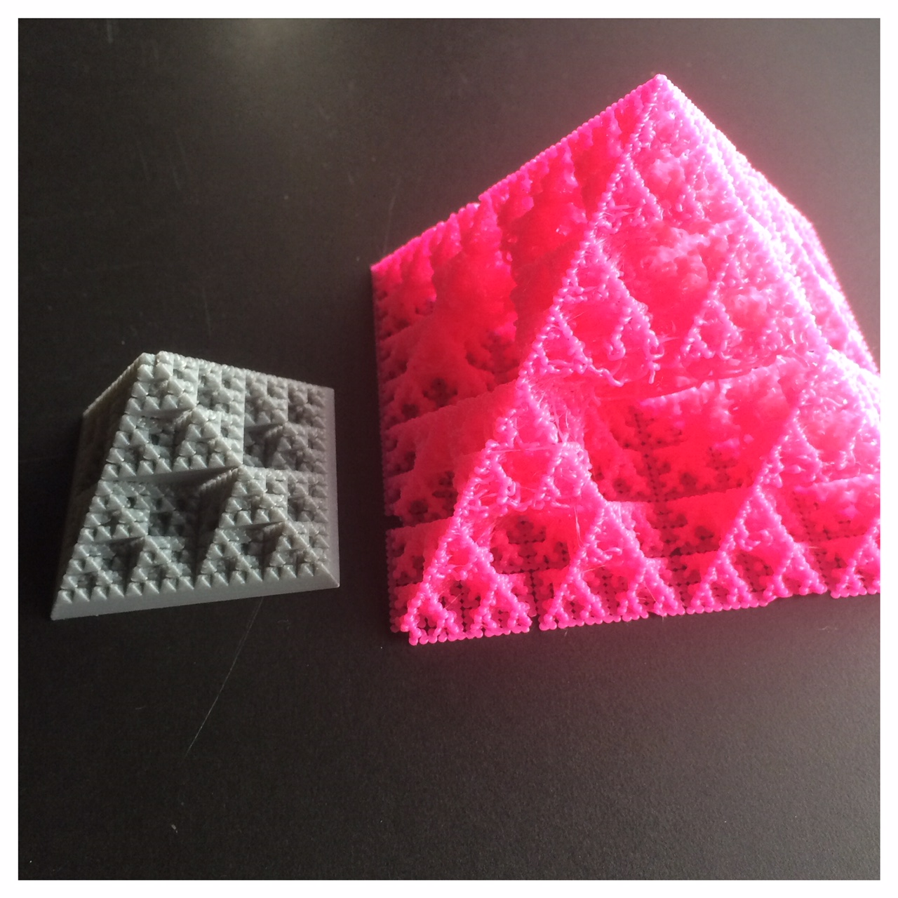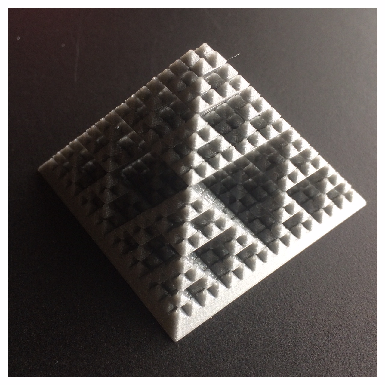 So at one of the small Maker Spaces at a public school here in Vejle we have two different printers. A Ultimaker 2+ and a Prusa i3. I wanted to try printing two different and slightly complicated prints in PLA to see the difference in the maschines and also test speed, nozzle and filament. I found this model of a pyramide fractal on Thingiverse.