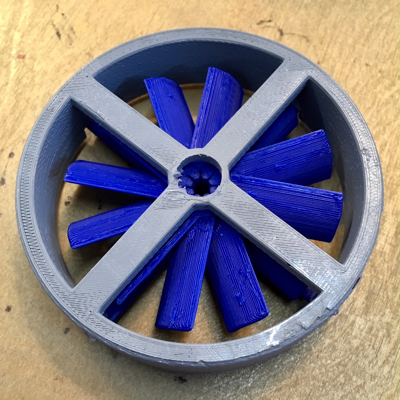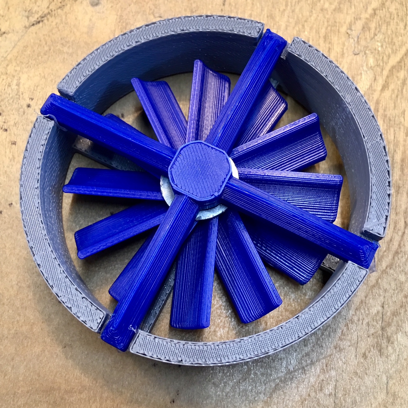 So this little turbine print in PLA I printed togehter with some students (at the age of 12 years old) at the public school's Ultimkaer 2+. It became a part of a project assignment for the 7th graders. They worked with green energy and would like to make a small turbine. The program used for this was Fusion 360 (I included the three files at the top of this site).