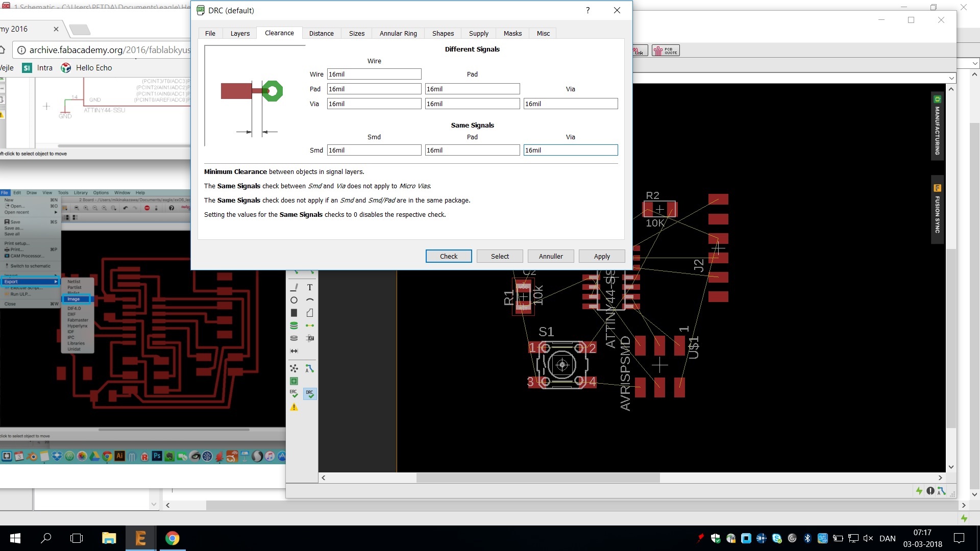 Then I connected each parts using "wire", "label" and "define name/value". After that, I clicked GENERATE board for designing the board and connected each parts using "route". Here I found out after several attempts an important settings when drawing circuit boards with the specifications of the milling machine. I had to choose millimeters under grid and make the route 0,4064 mm. and under DRC all values in the clearance and supply tab should be set to 16 mill and the maximum width in the sizes tab should be set to 16 mill cf. my picture below.