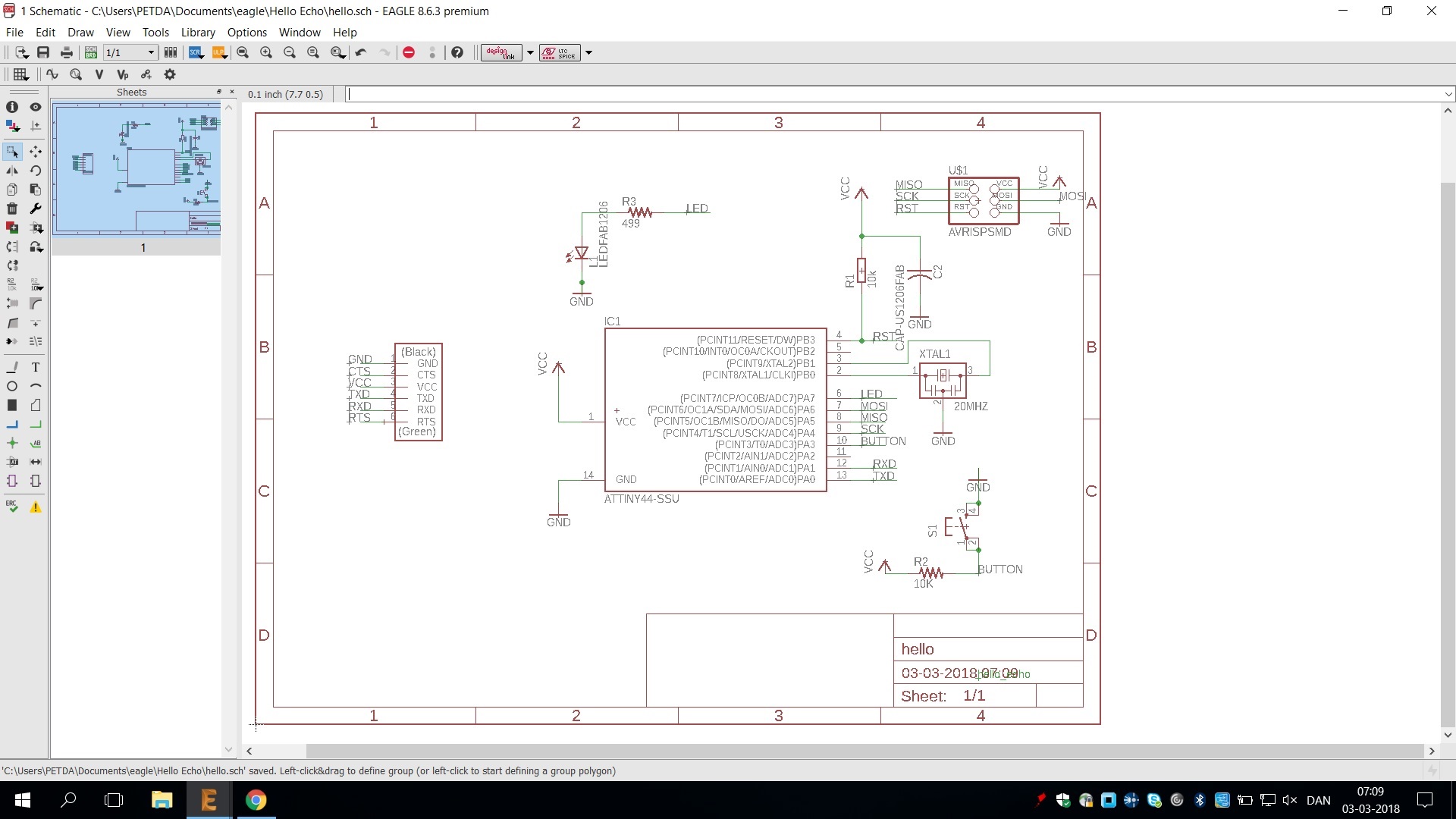 This week's assignment is "redraw the echo hello-world board, add a button and LED check the design rules, and make it"