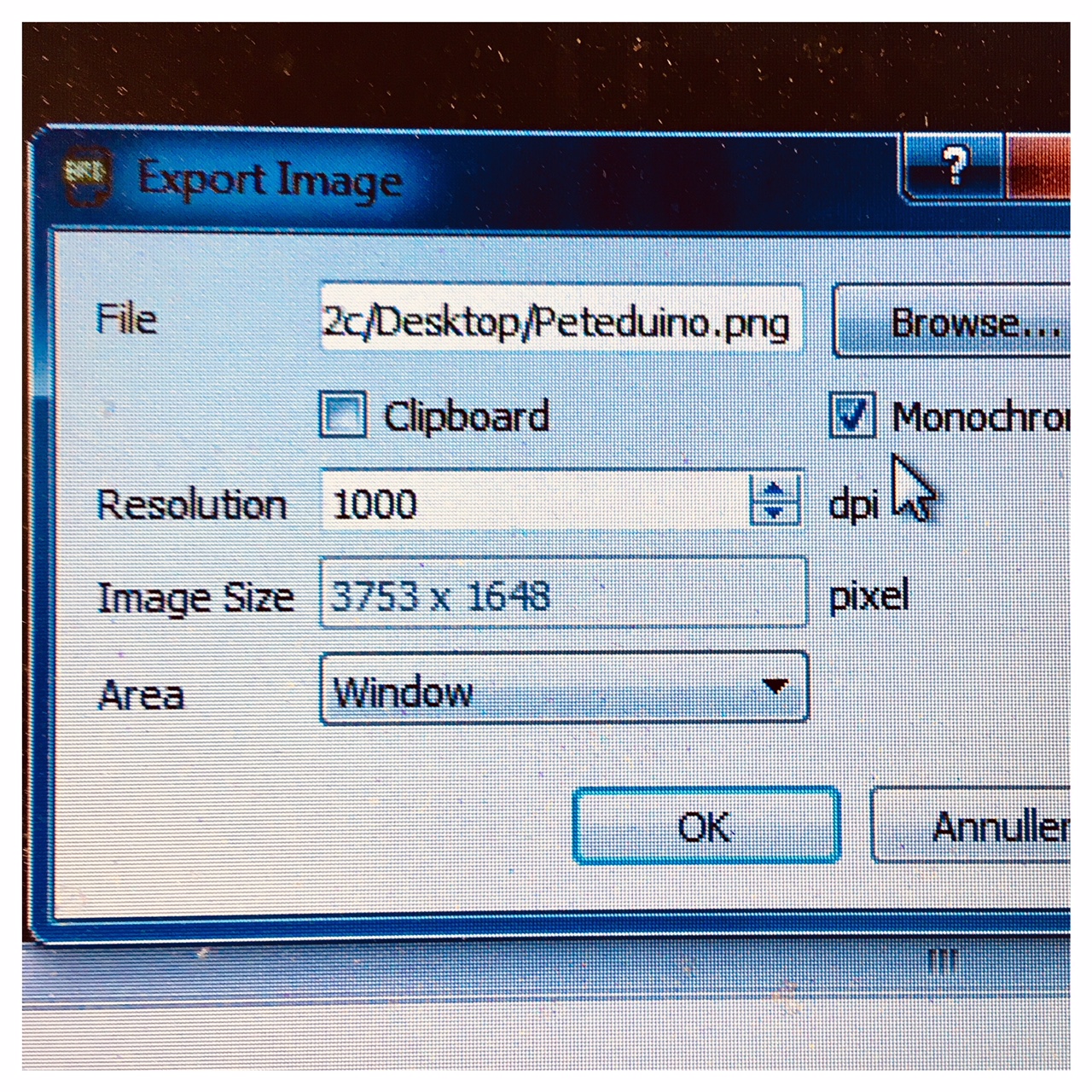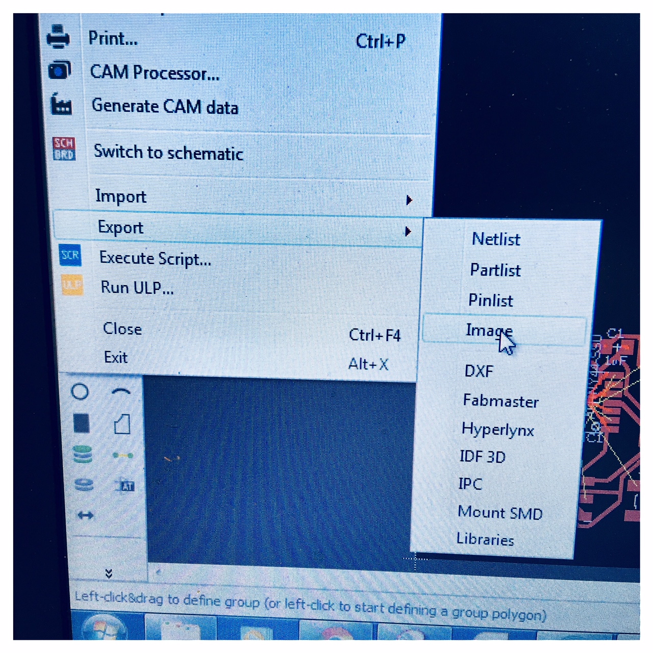 When I came to the issue of exporting the circuit I had made I vent to tools and layer settings to only select the top layer and pads. When exporting the image as an .png-file I selected monochrome and a 1000 dpi as suggested by our Fab Academy instructor.