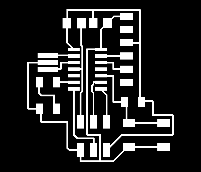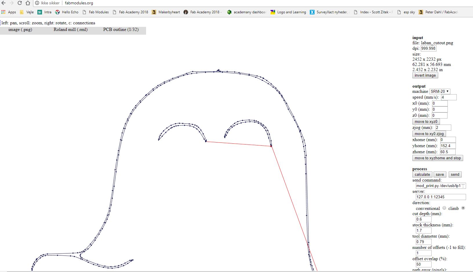 Then I exported the board design both traces and dimensions as monochrome image (.png). as described in the tutorialsite under Eagle. For creating the milling path I used www.fabmodules.org as with the ISP in week5. The toolbits we all used in Fablab Spinderihallerne for our Roland Monofab srm-20 and these milling projects are the 1/64 for milling traces and the 1/32 for milling the outline.