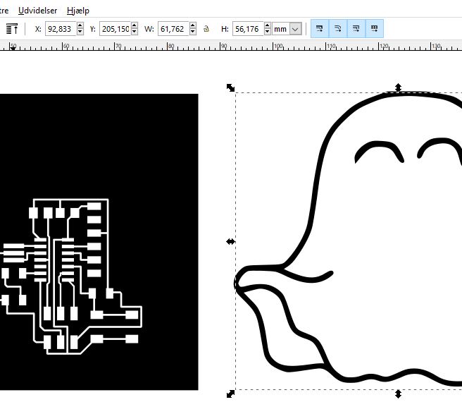 It's a bit cumbersome and there are probably easier ways to do it than the way I do it. But I import my trace (the monocrome png from Eagle) to InkScape and my silhouette of a ghost I wanted to function as the cut-out or interior. Then I make sure that the ghost get an appropriate size so that it can contain my entire eagle trace inside, with enough room, so that the cut-out do not interfere with the traces (as the mistake I made on my first ghost, check the image in the top of this site).