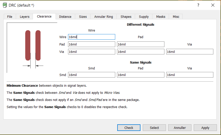 A couple of important settings when drawing circuit boards with the specifications of the Roland milling machine we have in our lab, is to choose millimeters under grid and make the route 0,4064 mm. Under DRC all values in the clearance and supply tab should be set to 16 mm and the maximum width in the sizes tab should be set to 16 mm.