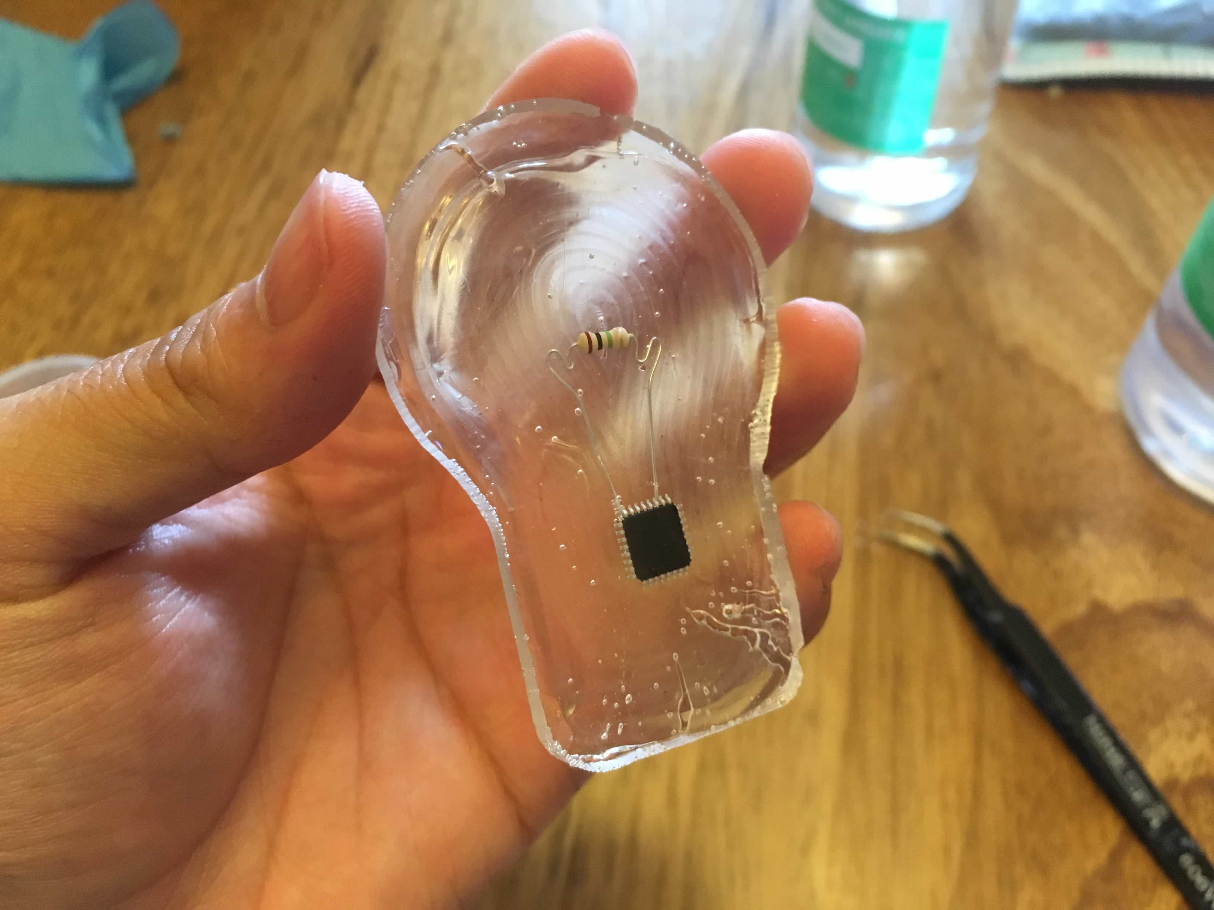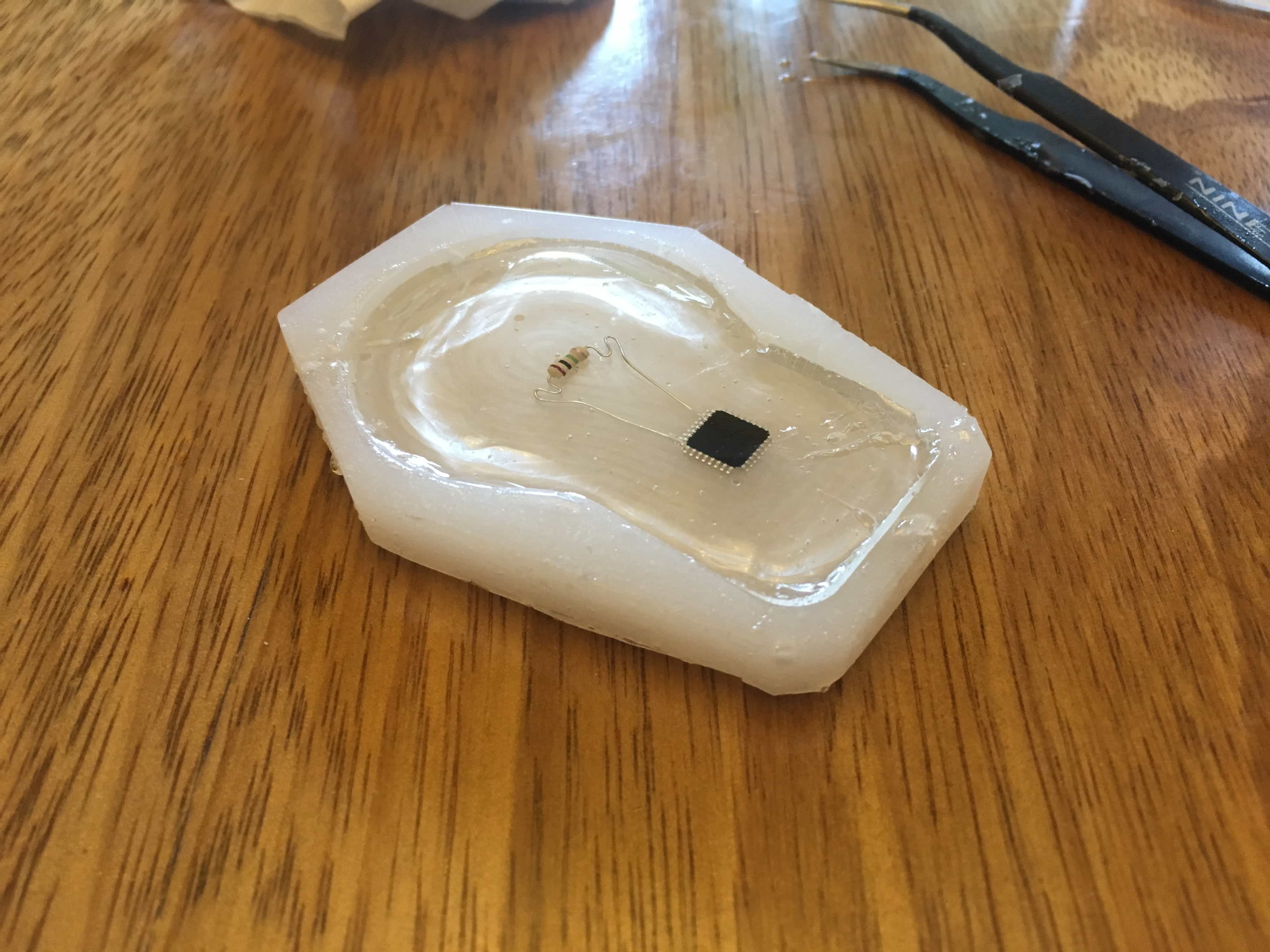 Finally, I add a resistor and a microcontroller into the expoxy to make the model really looks like a lightbulb.