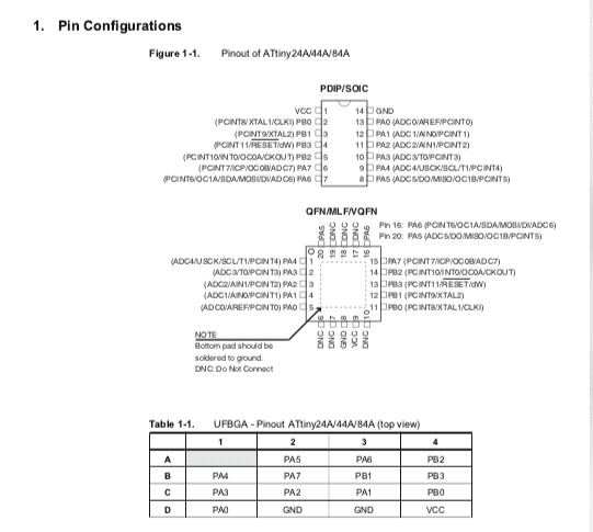 Importantly, PB0 and PB1 have "XTAL" functions, which means if I want to add an external clock, I have to connect the two pins of my resonator to PB0 and PB1.