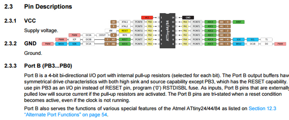The datasheet is the manual of any electronic components They explain exactly. How to use and what are they for. It delivers you an idea especially for someone like he this is for him and experiences it shows or informs are the pins configurations like important features (memory, number of pins, power, and ground). From the datasheet and the diagram for ATtiny 24/44/84, there are two sections on the chip as PA and PB, VCC, GND RESET
