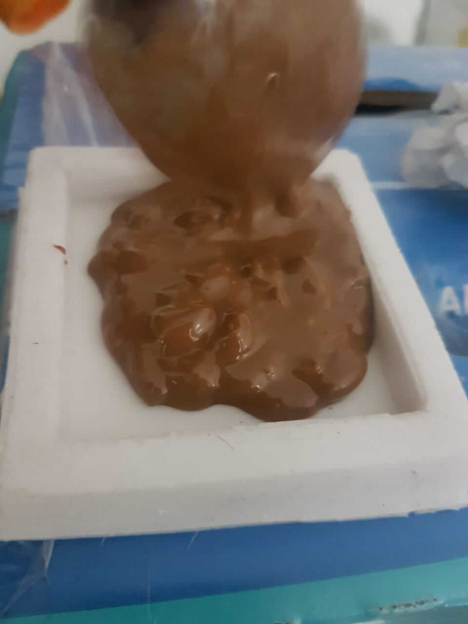 First, we prepare the chocolate by melting it. Then, we pour it into the mold beeing carefull to fullfil every space of the mold. And we take it to the fridge.