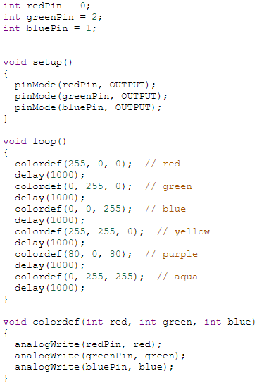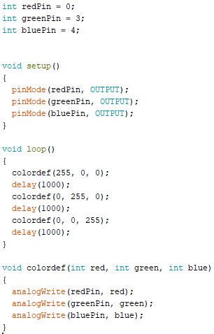 Now we jump to "colordef" function. There color parameters are created (red , green and blue) and set to be the parameter for the "analogWrite" function.