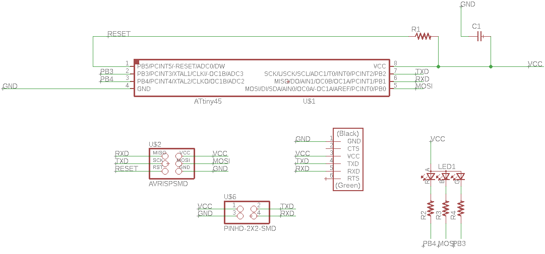 Using week 11 schematics as base, I replaced the LEDs and their resistors, the button and it's pullup resistor;
