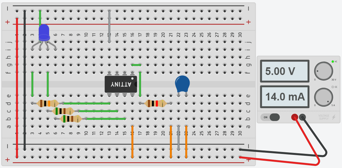 the "PMW" pins to regulate color. If we only use digital output, we could only get solid colors and mixes between them. However, pinout from tiny45
