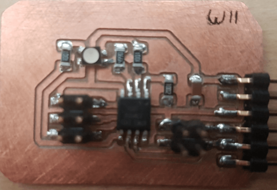 with a RBG LED and 3 resistor on each leg. Similar to that week, 2x2 headers are used to later comm work.