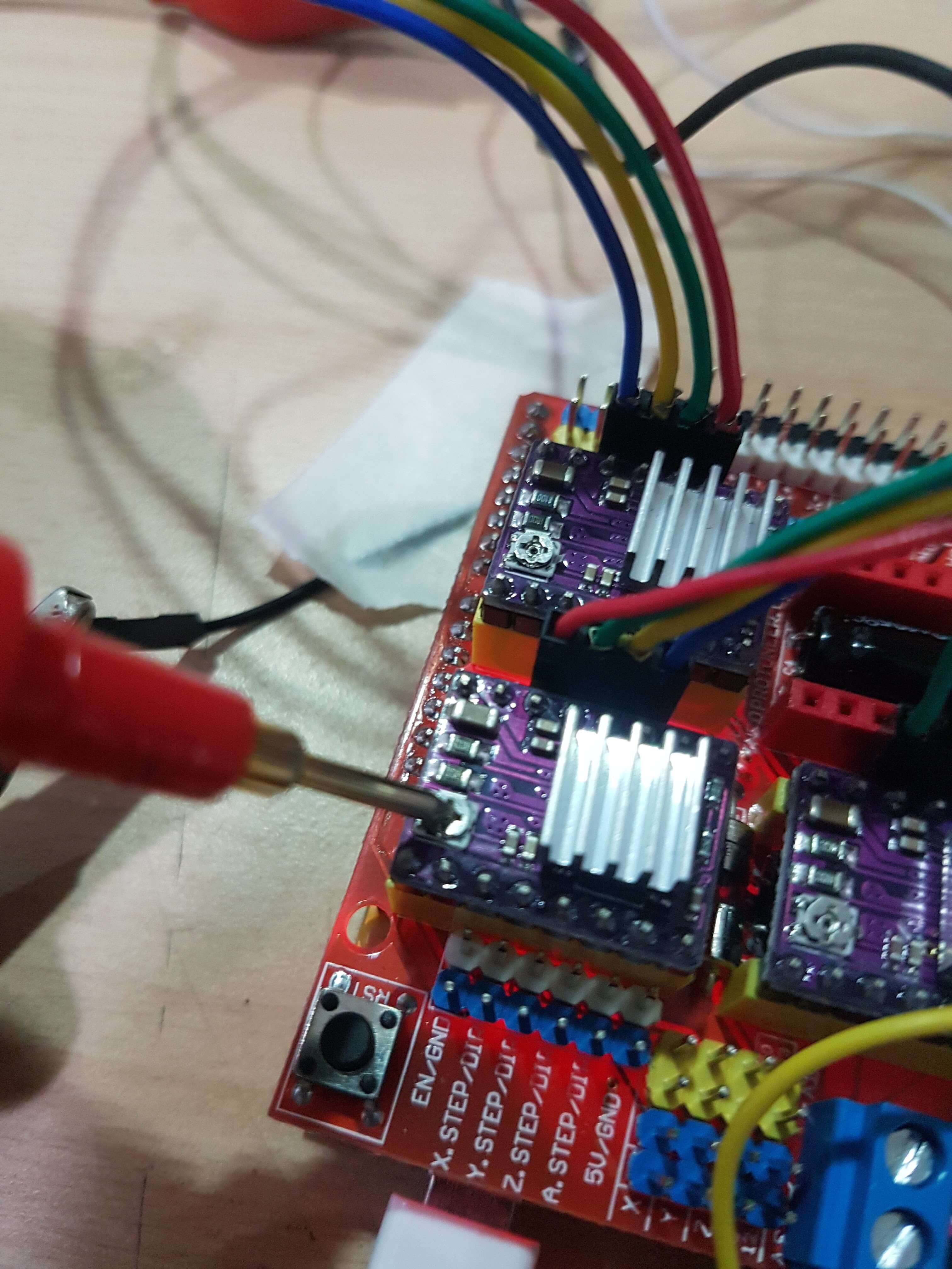 We are using a CNC shield with 4 motor drivers from Texas Instruments (DRV8825). Those drivers need to set for each stepper motor. Each unit controls current passing to the steeper,