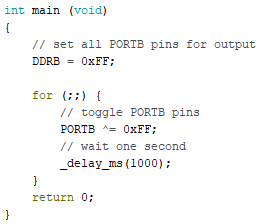 A "For" function with no condition runs the snippet with toggle function for light on/off the LED while delaying 1 second between actions.
