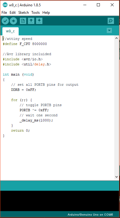 I will be coding to the Week7 board with Arduino languaje and C to blink the LED on Pin 2. To program the micro, an arduino as ISP will be used.